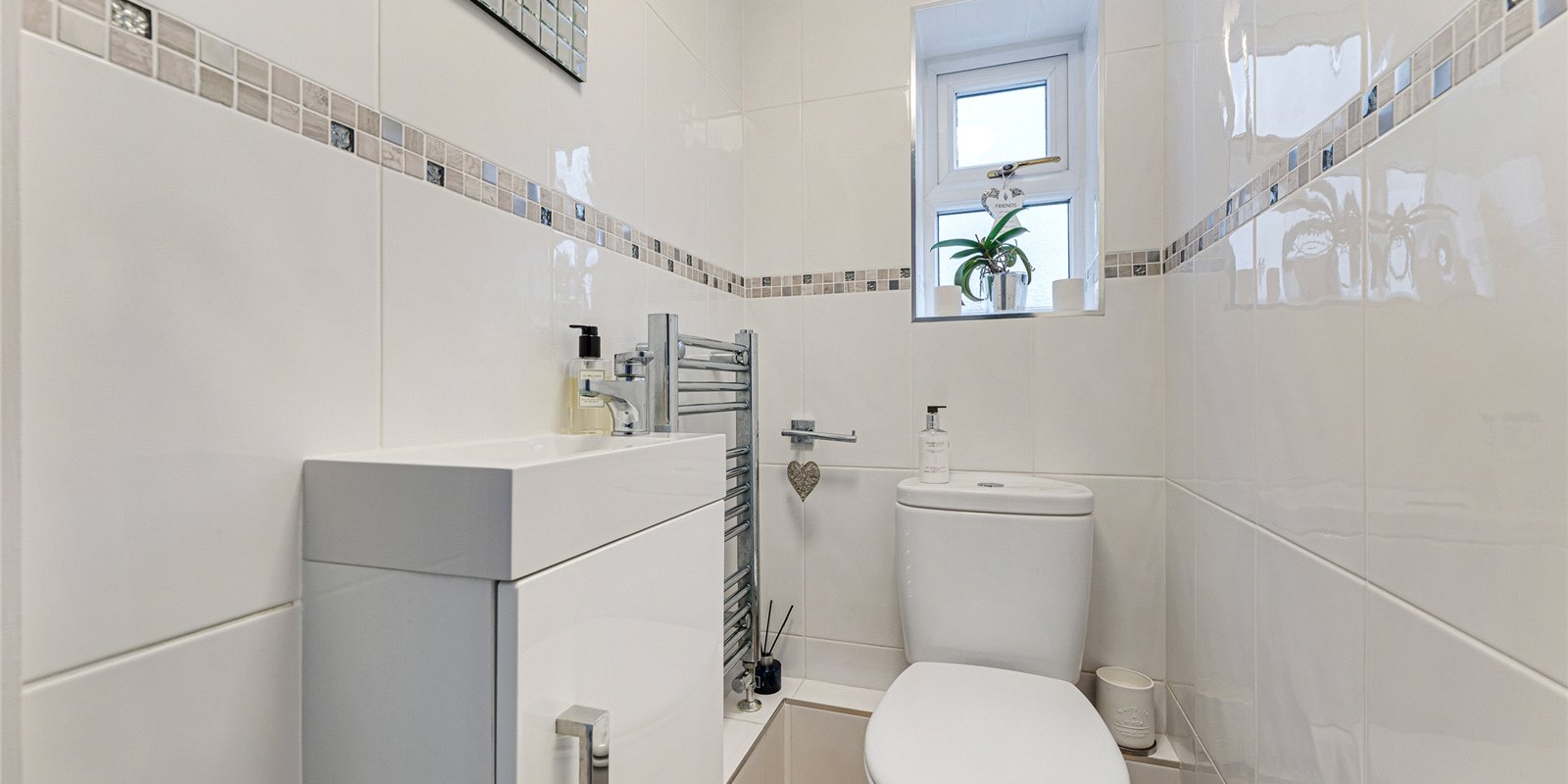 The modern kitchen is both stylish and functional, complemented by a separate breakfast room—perfect for casual family meals. A convenient downstairs WC is discreetly located under the stairs.