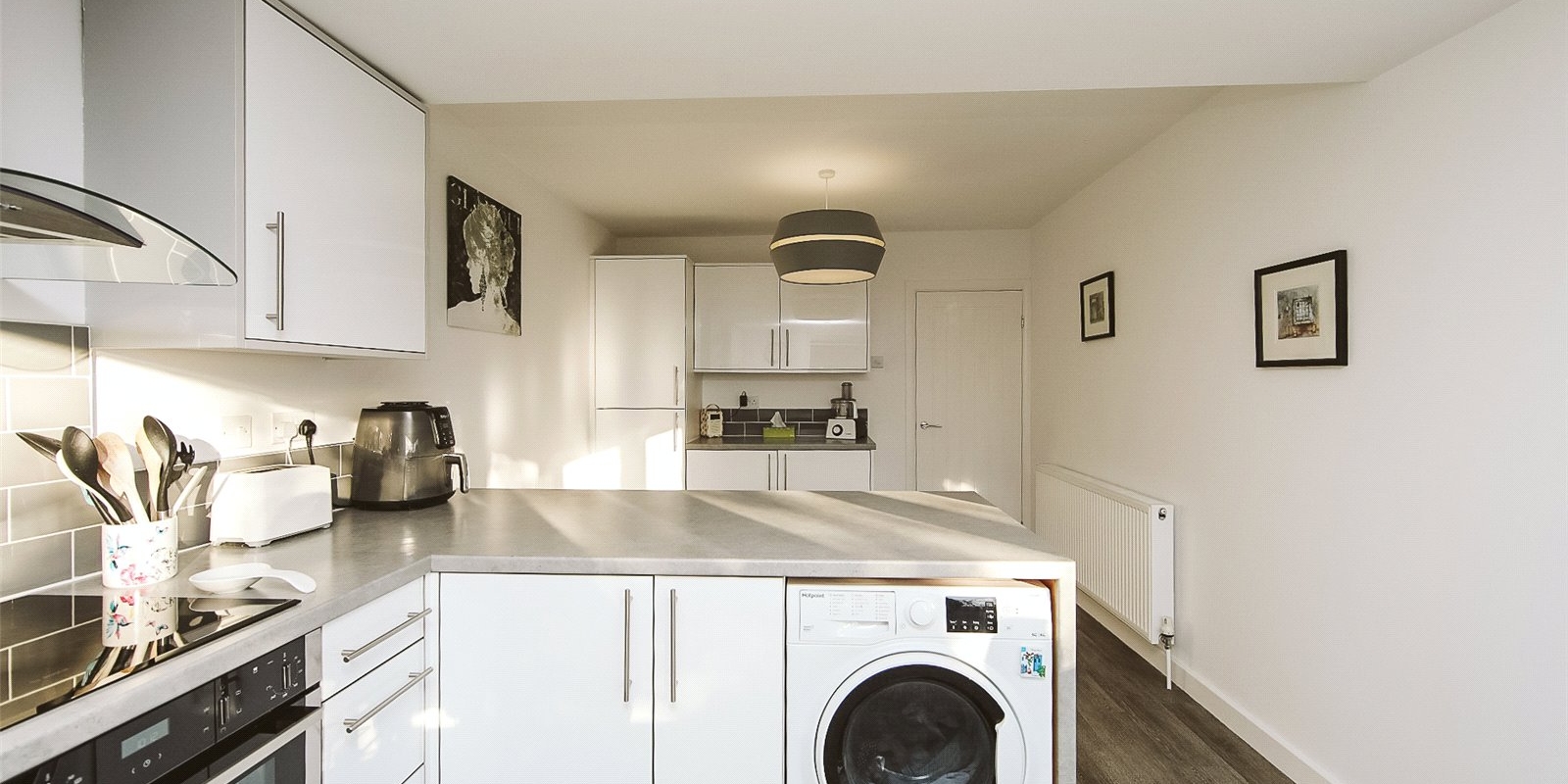 The welcoming entrance hall leads into a spacious open-plan living area, seamlessly connecting the living room, dining room/optional bedroom, and the impressive modern kitchen. Flooded with natural light, the kitchen features generous floor space perfect for cooking, dining, and entertaining.