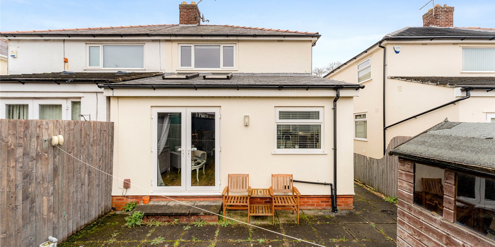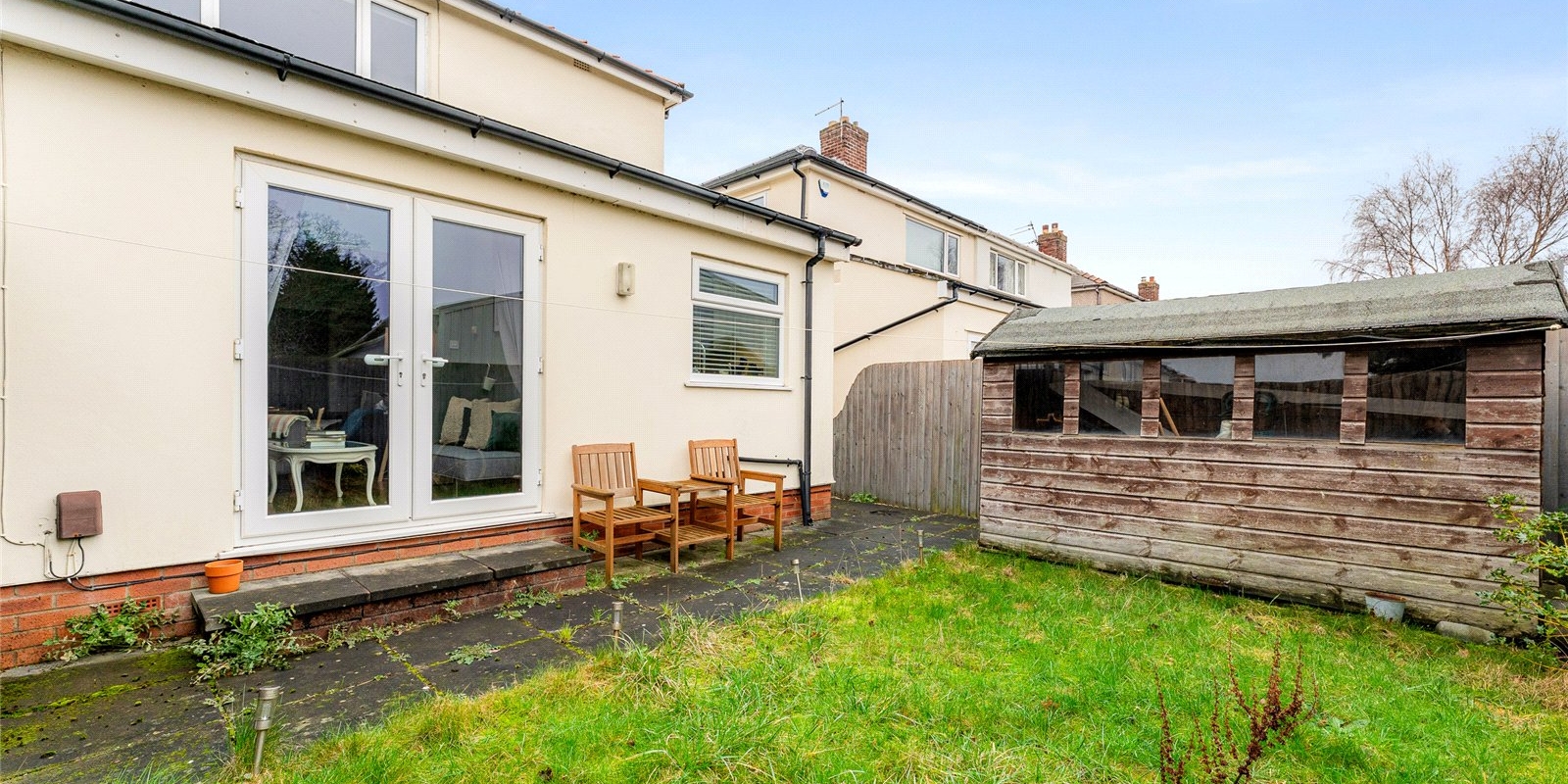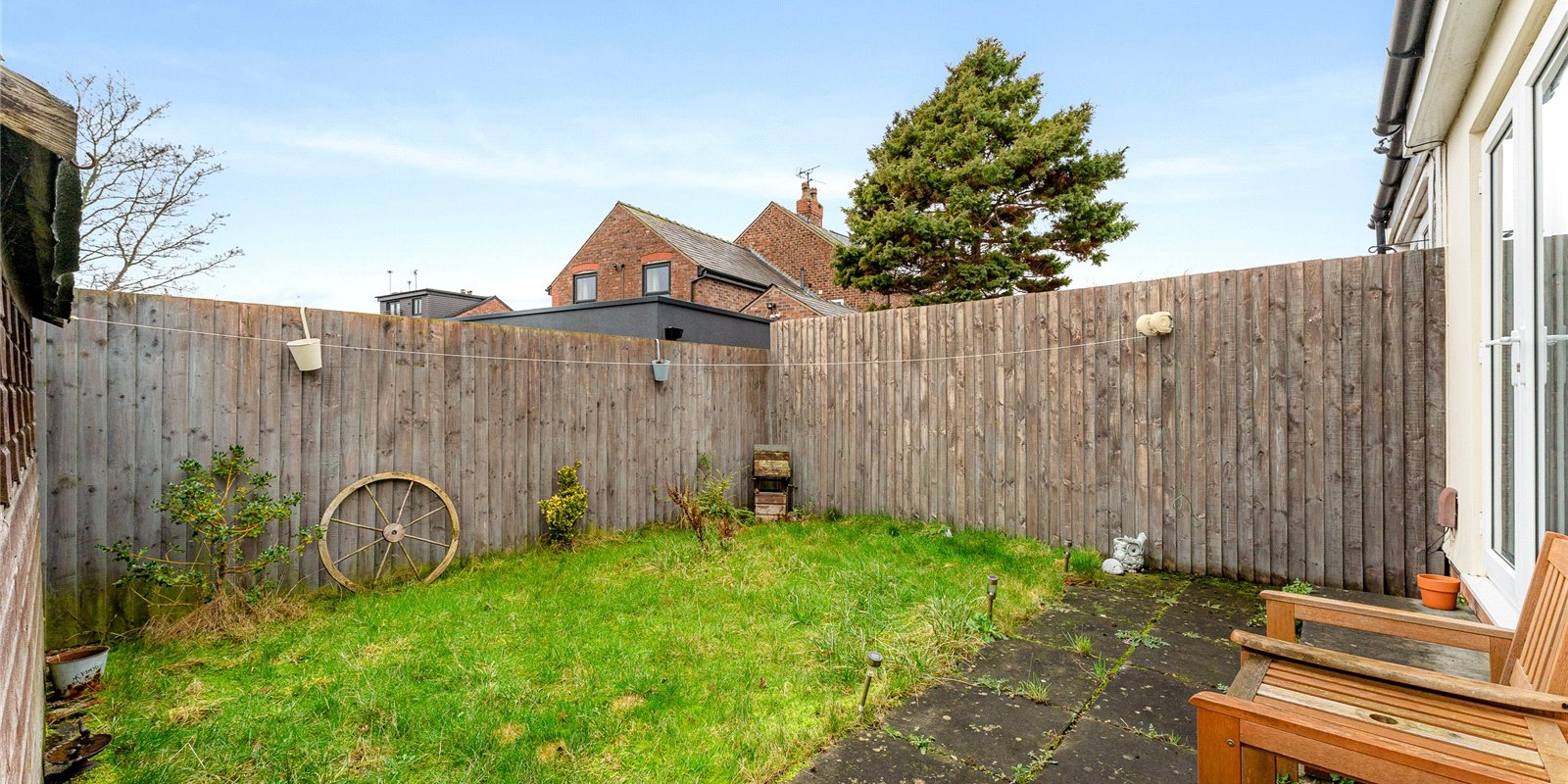 The garden itself is designed with low-maintenance in mind, with plenty of space for gardening enthusiasts or families to enjoy outdoor activities. A practical shed is located at the end of the garden, providing valuable storage space for tools, bikes, or garden furniture.
