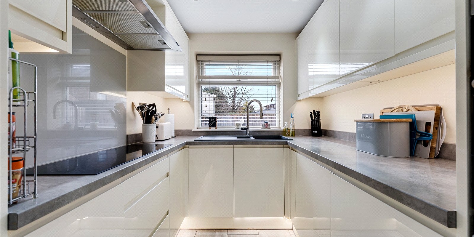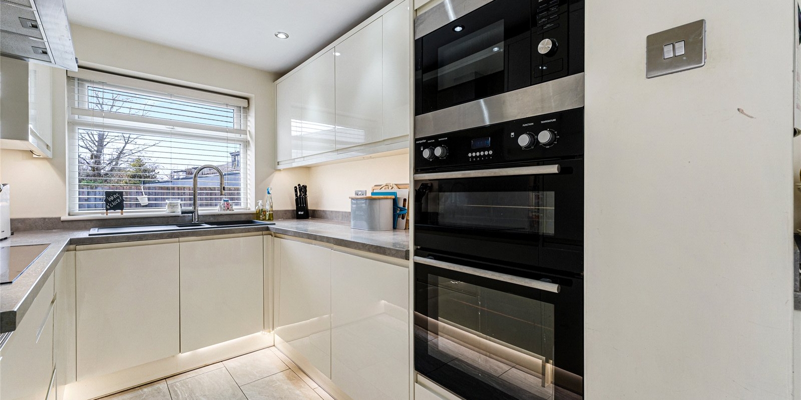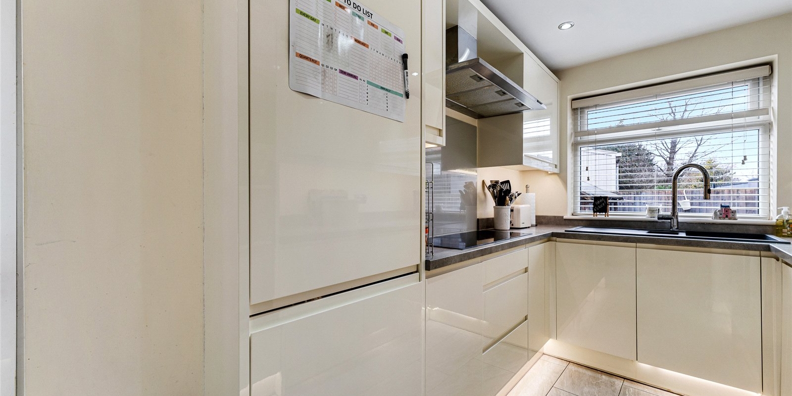 The heart of the property is its stylish, contemporary kitchen. Finished in white tones, it features integrated appliances, ensuring a clean, clutter-free look. The kitchen also boasts a convenient breakfast bar, perfect for informal dining or entertaining guests. A door leading from the kitchen provides direct access to the well-maintained garden, making outdoor dining or relaxation a breeze. Additionally, a side entrance runs along the house, offering easy access to the rear garden area.