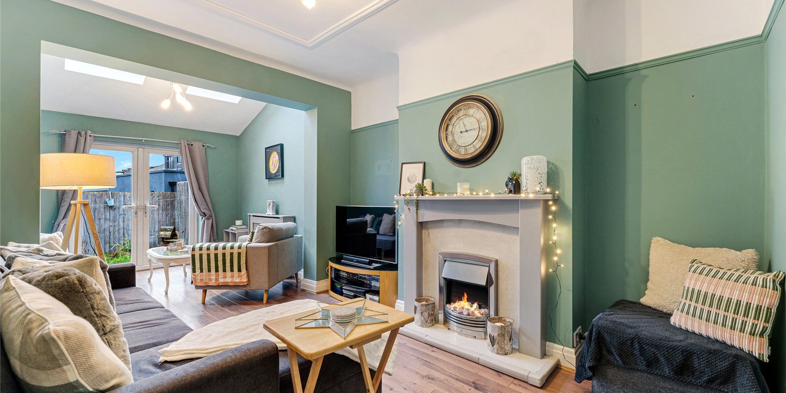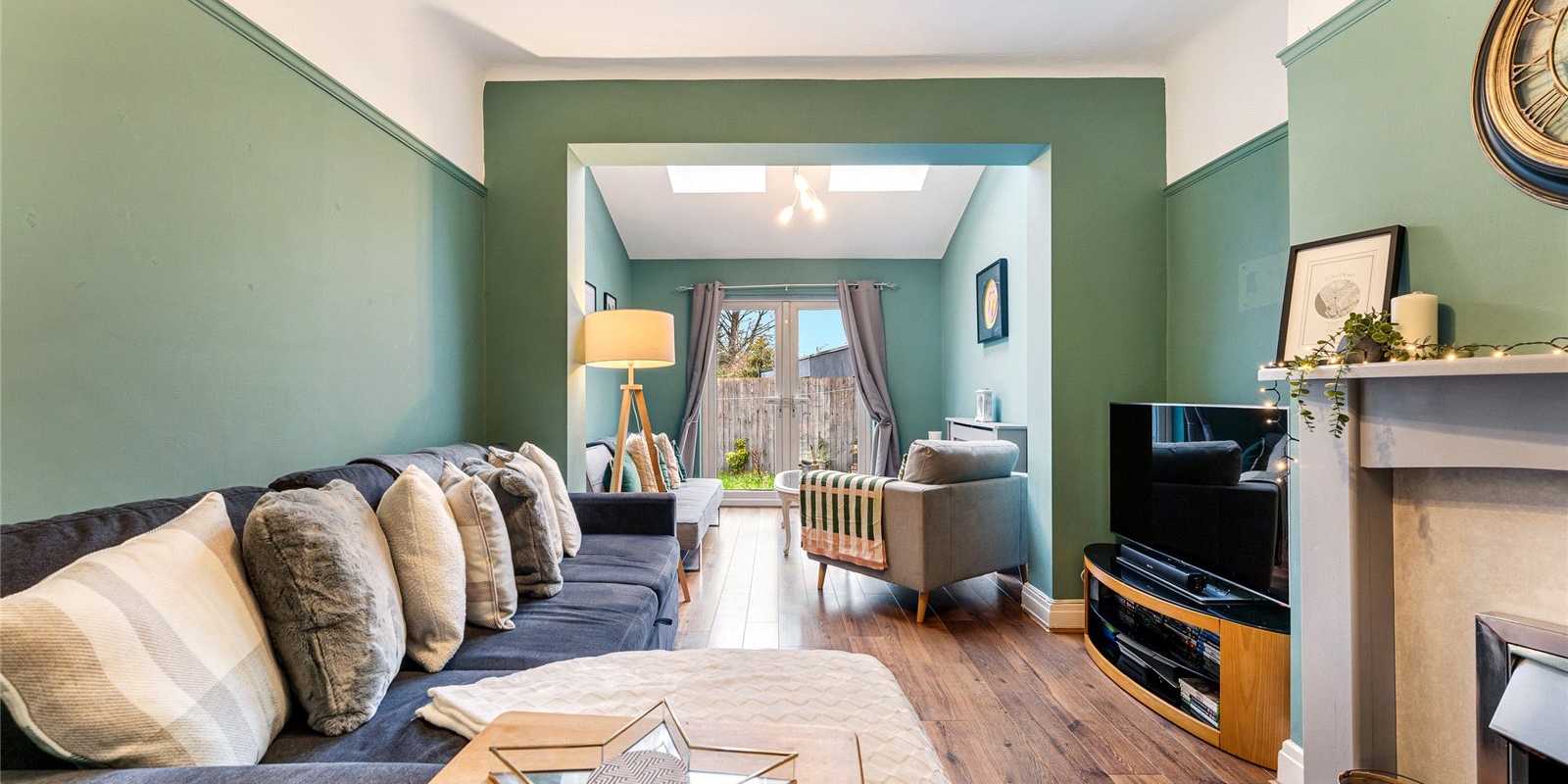 The second reception room is an open-plan living area, perfect for family relaxation. It is incredibly bright and vibrant, thanks to the skylight that allows daylight to pour in from above. This room blends the functions of a living room and a dining room, offering ample space for a variety of uses. Double doors lead from this room to the garden patio, creating a seamless flow between the indoor and outdoor spaces – ideal for entertaining or simply enjoying the peaceful garden views.