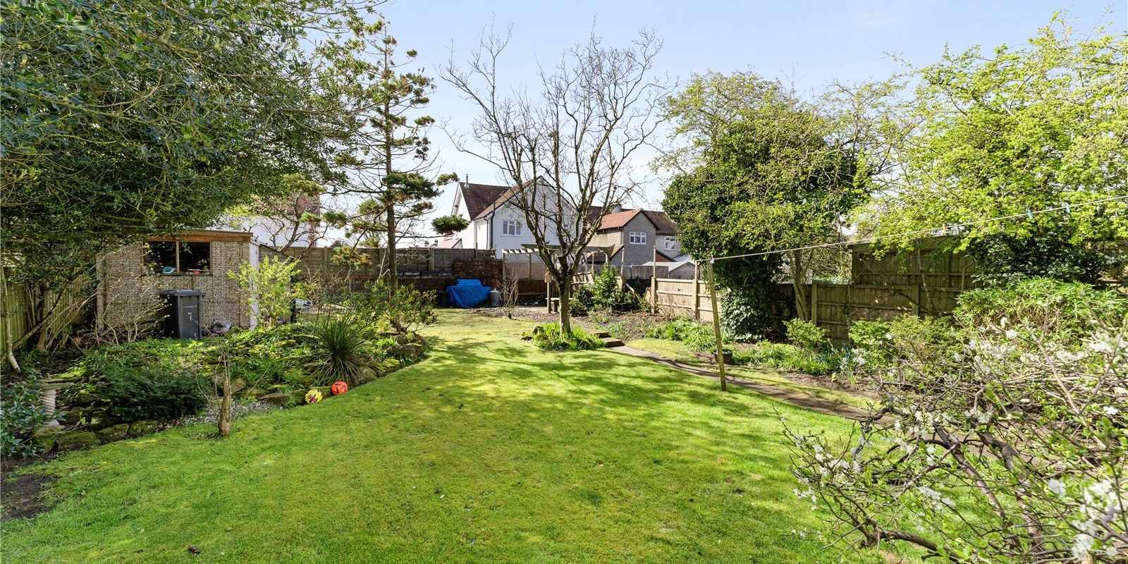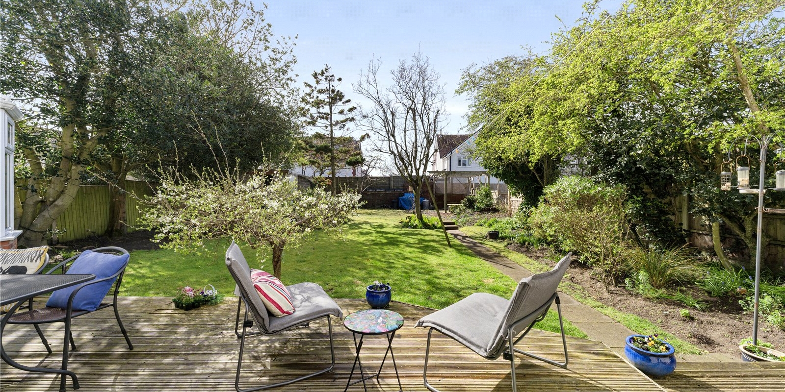 Externally, the property is equally impressive. A private driveway to the front provides convenient off-road parking. To the rear, the beautifully maintained south-facing garden is a standout feature, enjoying sunlight throughout the day and offering a high degree of privacy. Thoughtfully designed for both relaxation and entertaining, the garden includes a raised decking area ideal for outdoor dining, a pergola creating a charming shaded seating area, and well-kept lawned sections.