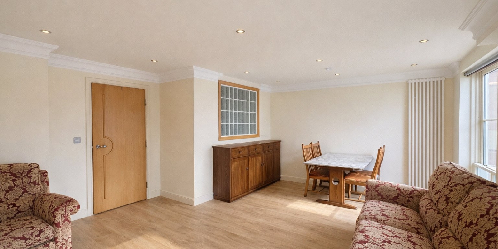 Lounge/Dining Area - 20' x 15' 6" (6.10m x 4.72m) Two double glazed sash windows, recessed ceiling with coving, spotlights, two central heating radiators, television point, telephone point, electrical points and space for dining table and chairs.