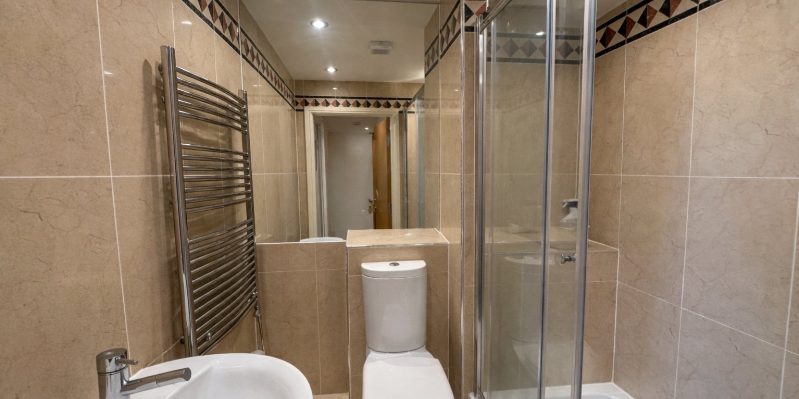Shower Room - 4' 11" x 6' 1" (1.50m x 1.85m) Modern white suite comprising of WC, pedestal hand wash basin and shower. Tiled walls & floor, recessed ceiling with spotlights, extractor fan and heated towel rail.
