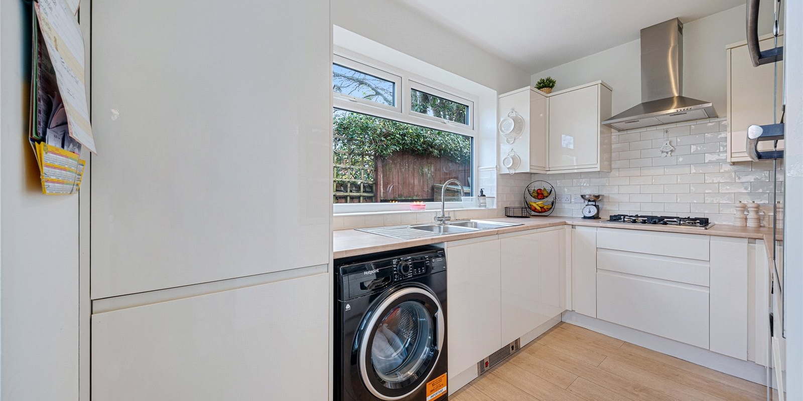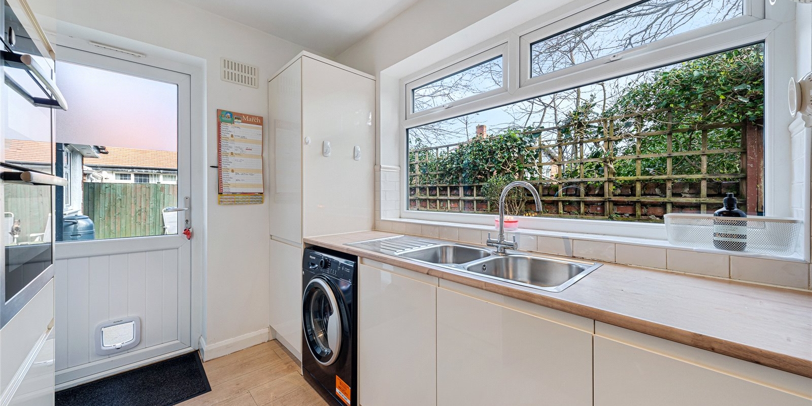 The kitchen is well-proportioned and conveniently located, with access to the rear garden. There are two generously sized bedrooms, including a large primary bedroom, along with a well-appointed bathroom.