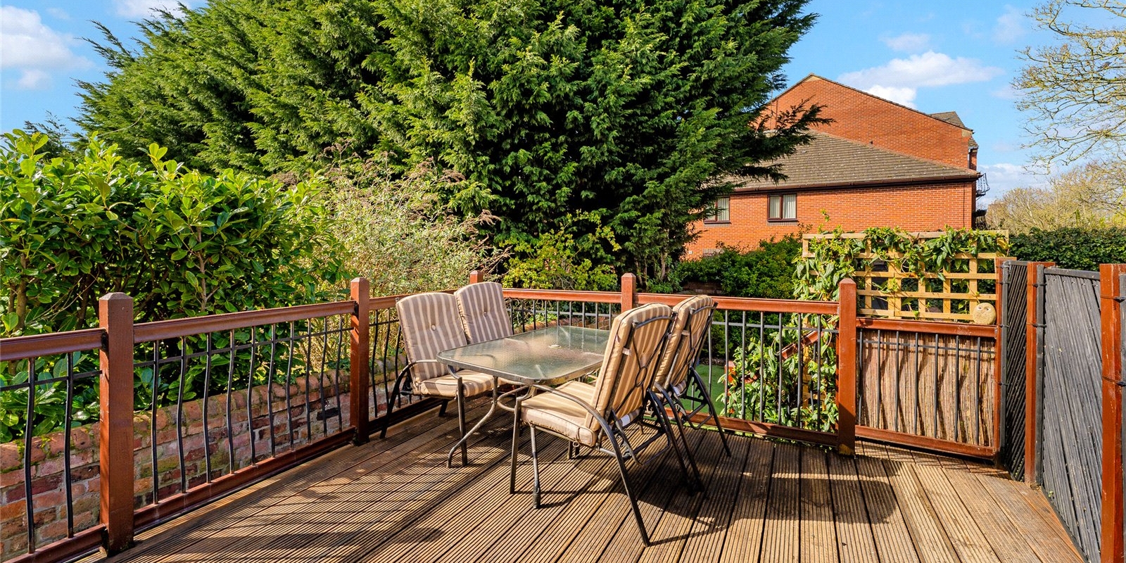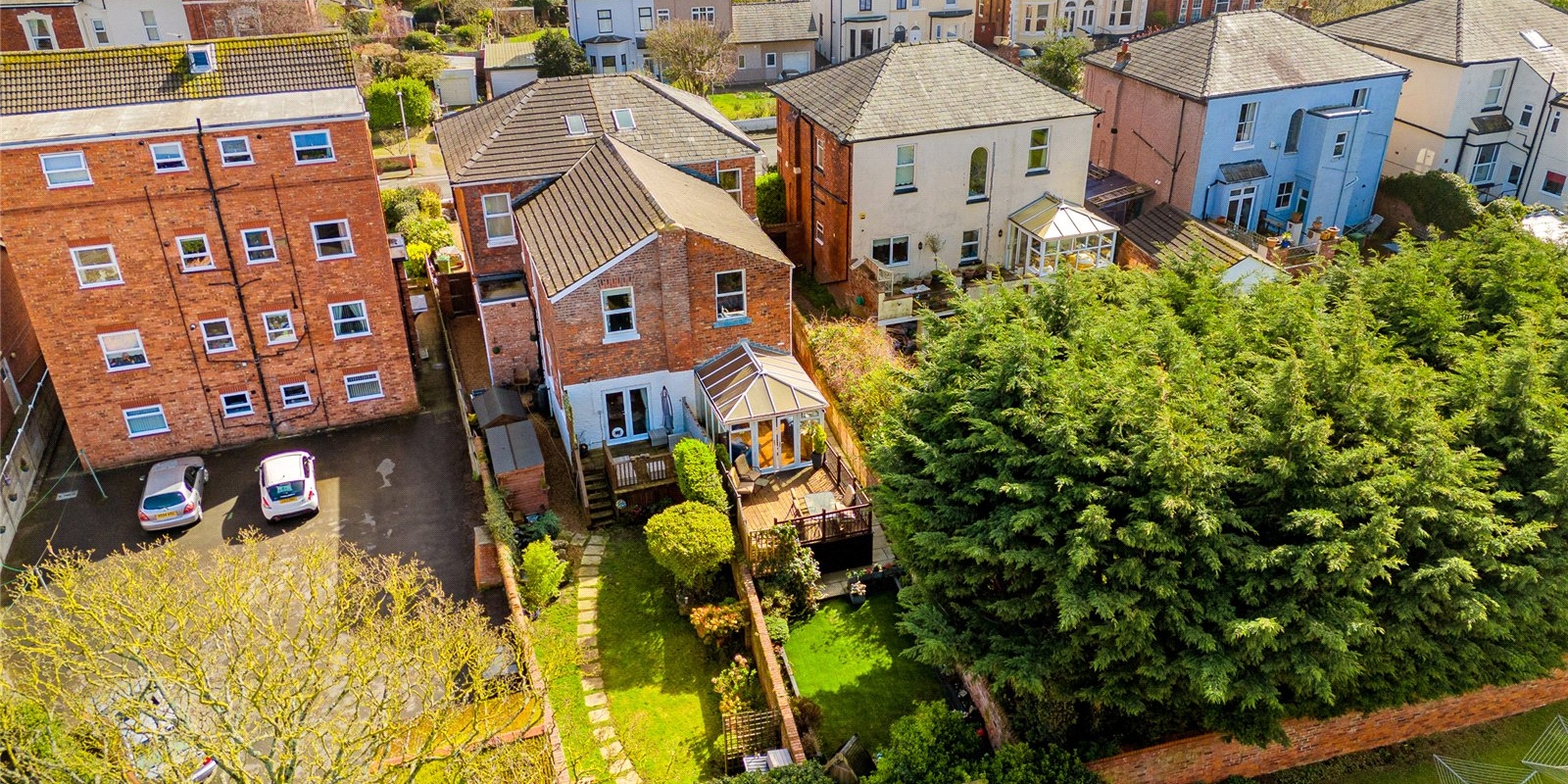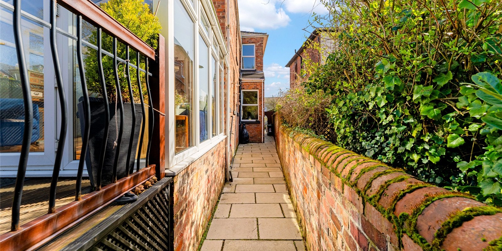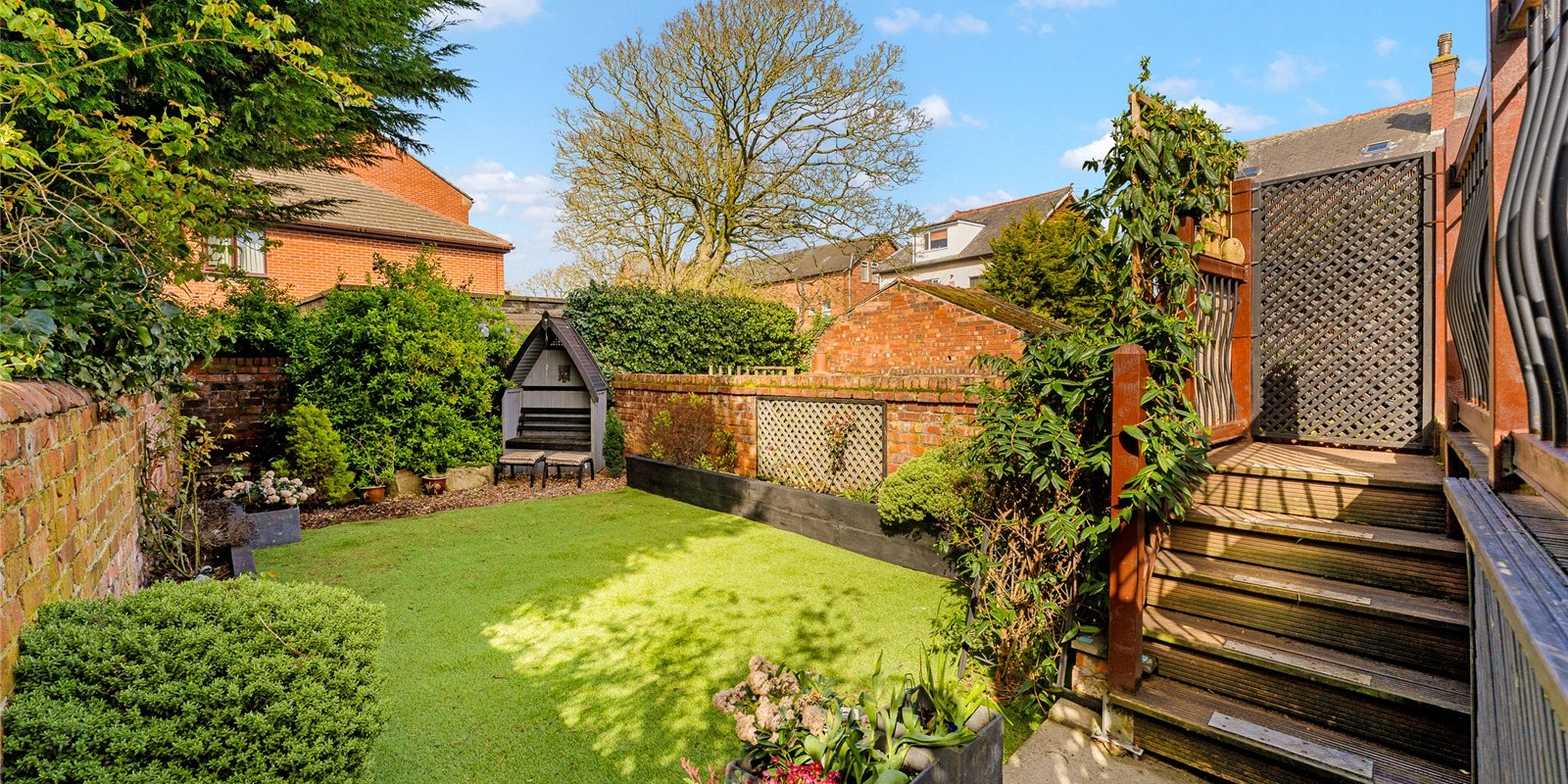 To the rear, a bright and airy conservatory creates an additional reception space, enjoying a sunny aspect and pleasant views over the garden. This leads directly onto a raised terrace—perfect for outdoor dining—while steps descend to a beautifully maintained, private garden, offering a peaceful retreat with a high degree of seclusion. A useful side access adds further practicality.