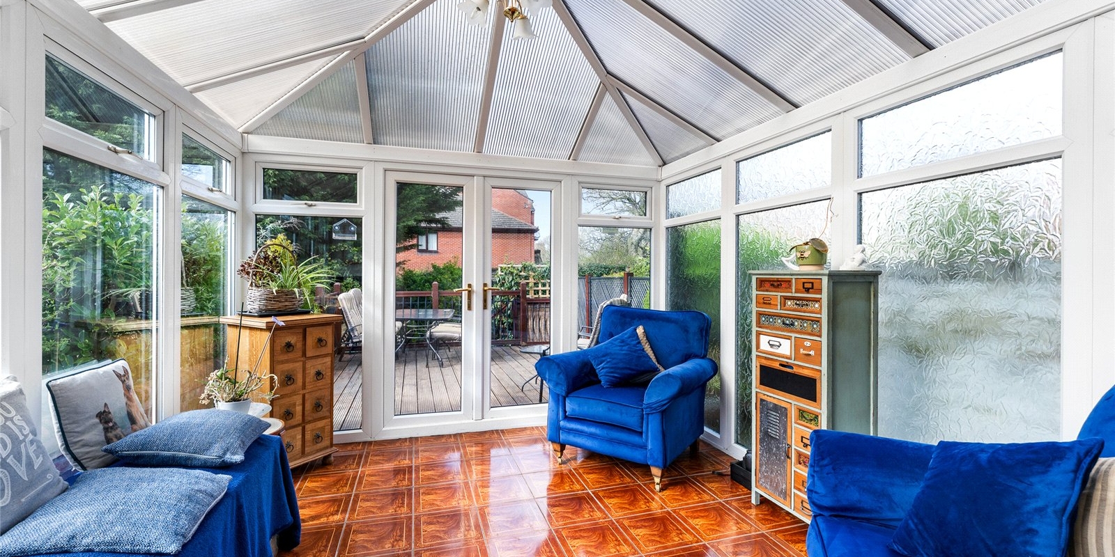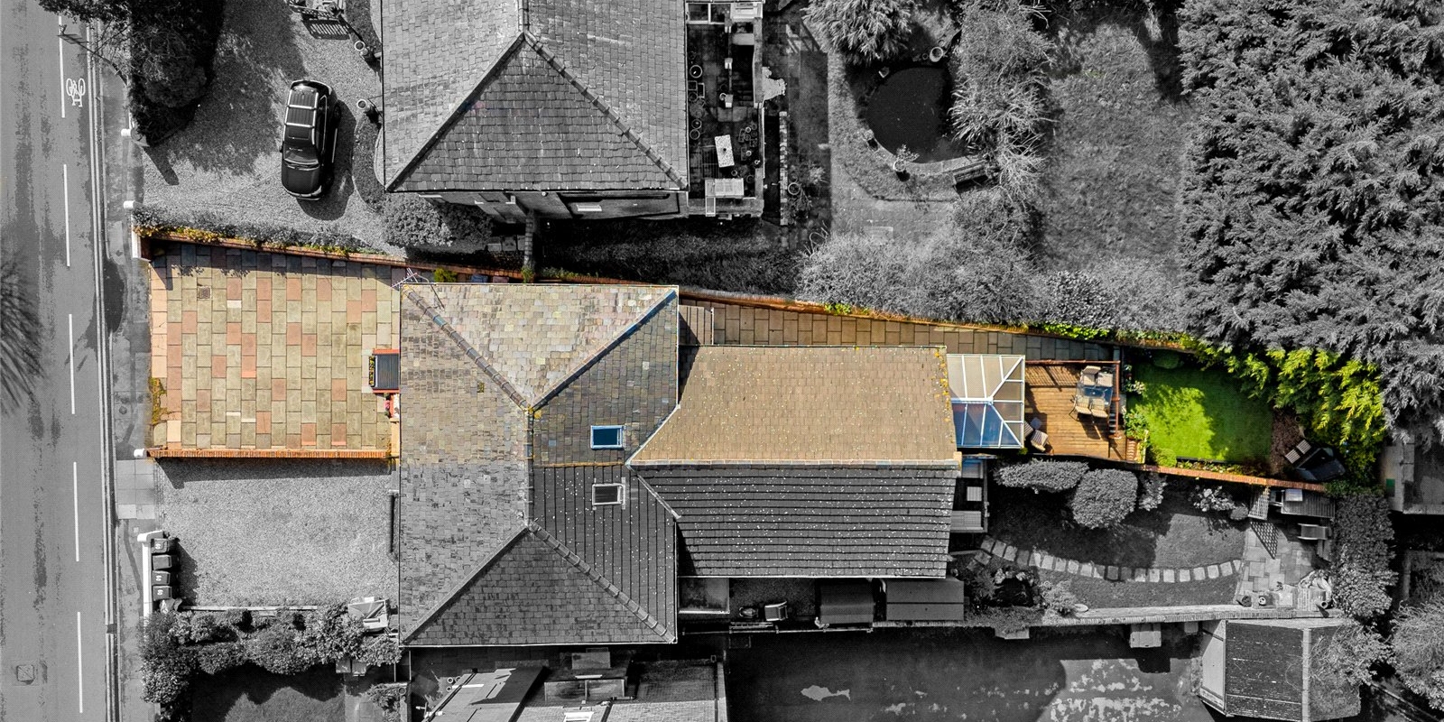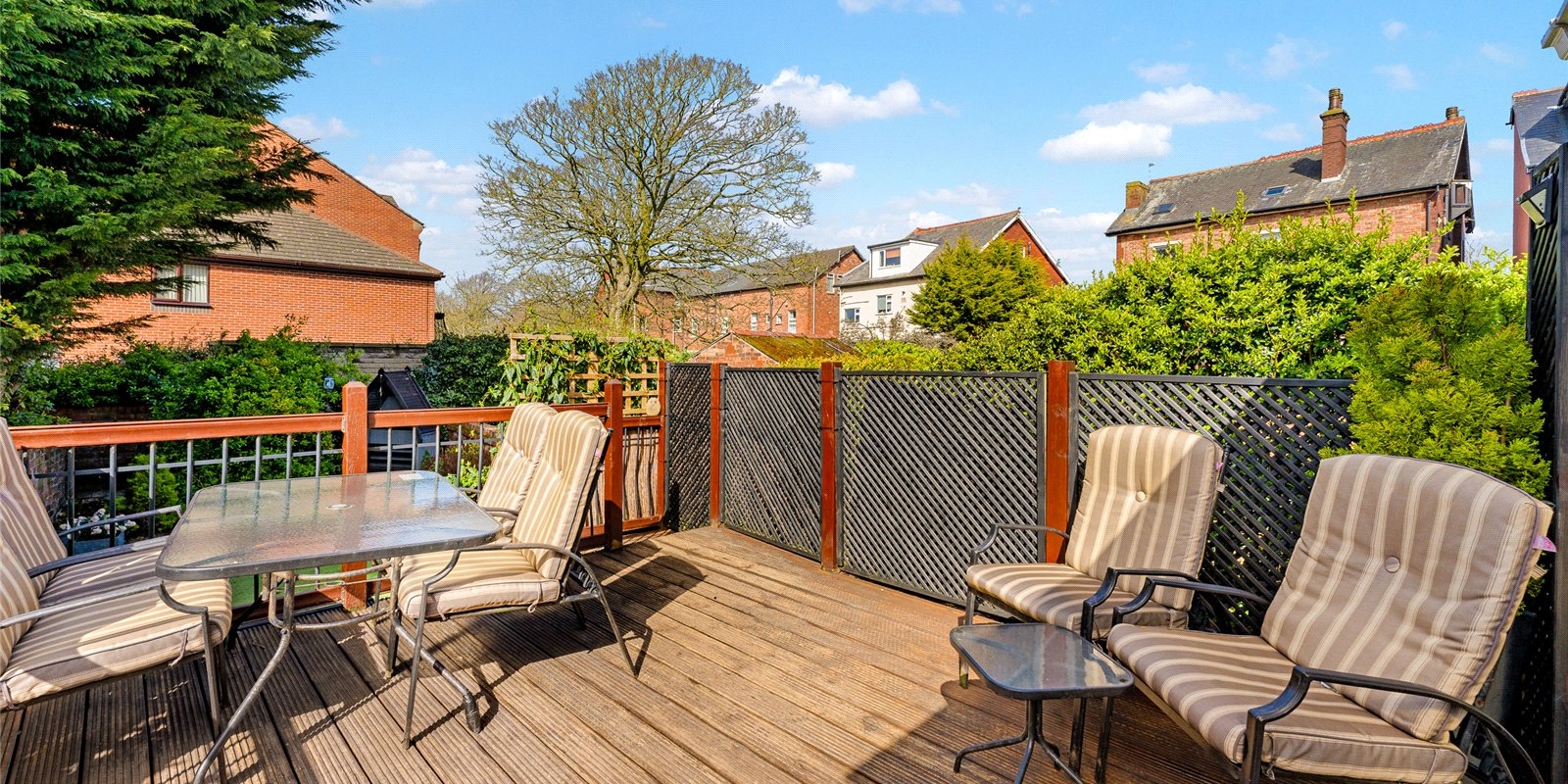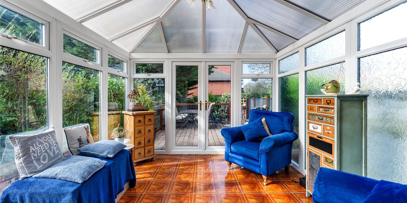 To the rear, a bright and airy conservatory creates an additional reception space, enjoying a sunny aspect and pleasant views over the garden. This leads directly onto a raised terrace—perfect for outdoor dining—while steps descend to a beautifully maintained, private garden, offering a peaceful retreat with a high degree of seclusion. A useful side access adds further practicality.