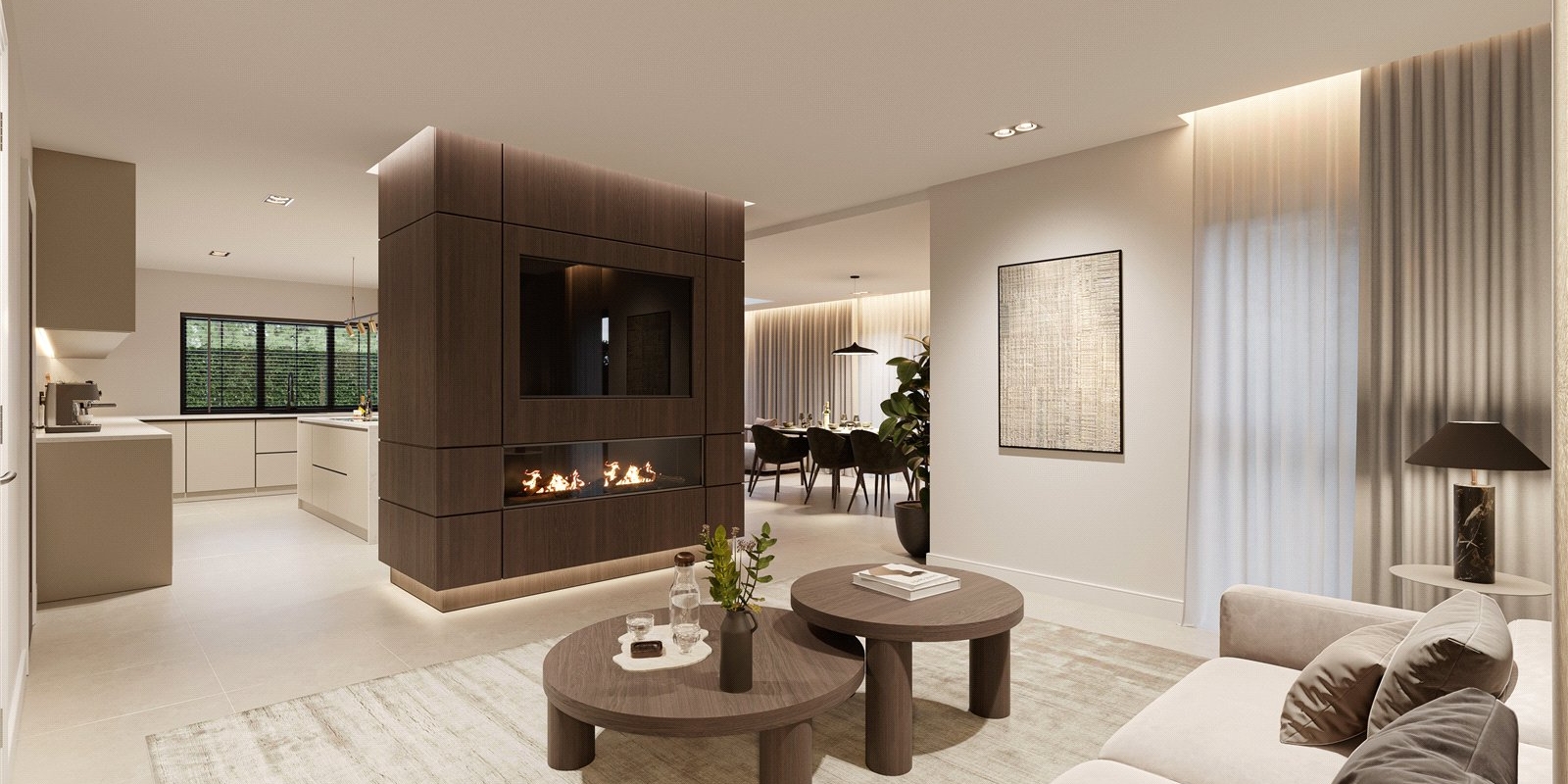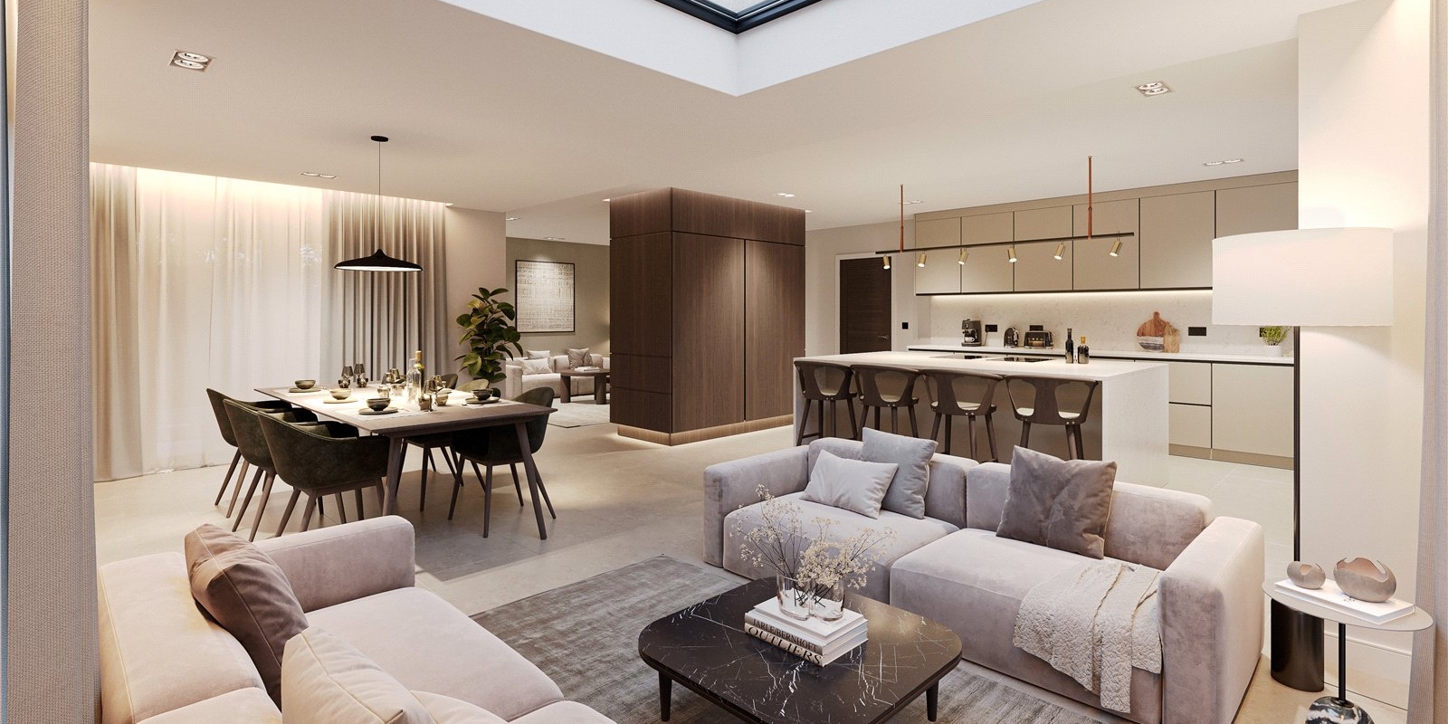 The ground floor has been designed around modern lifestyles, with an impressive openplan kitchen, dining and living space that flows seamlessly onto the landscaped garden and entertaining terrace, perfect for hosting, relaxing and everyday family life. A separate lounge provides an additional retreat, offering flexibility for quieter evenings or more formal occasions.