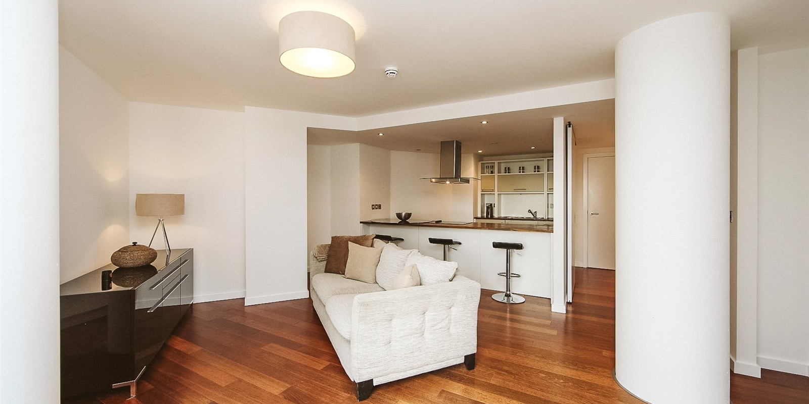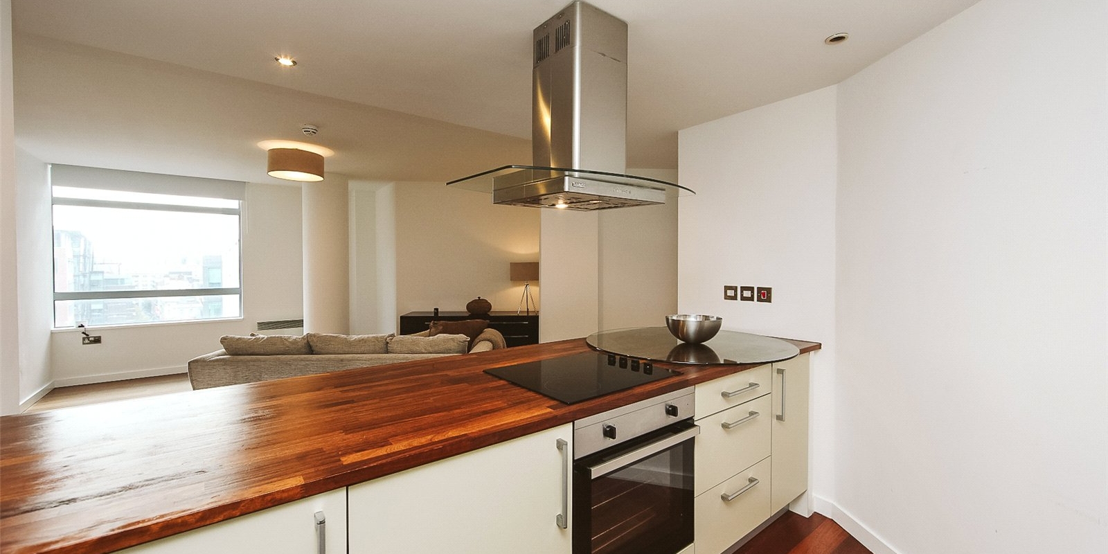 Positioned on the 8th floor of the iconic Beetham Tower, this modern two-bedroom apartment offers stylish city-centre living in the heart of Liverpool’s business district. The property features a spacious open-plan lounge and kitchen with large windows, flooding the space with natural light.