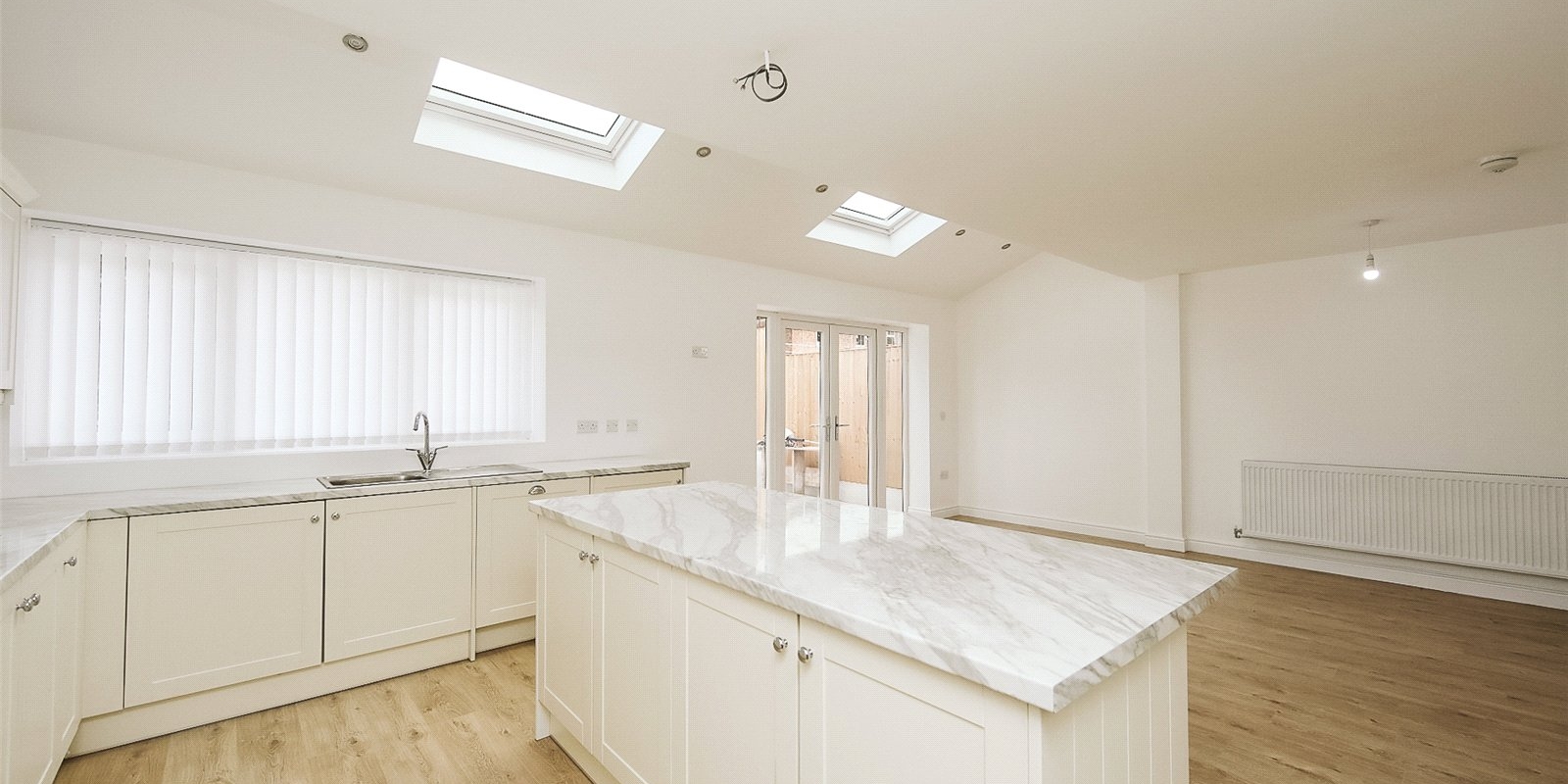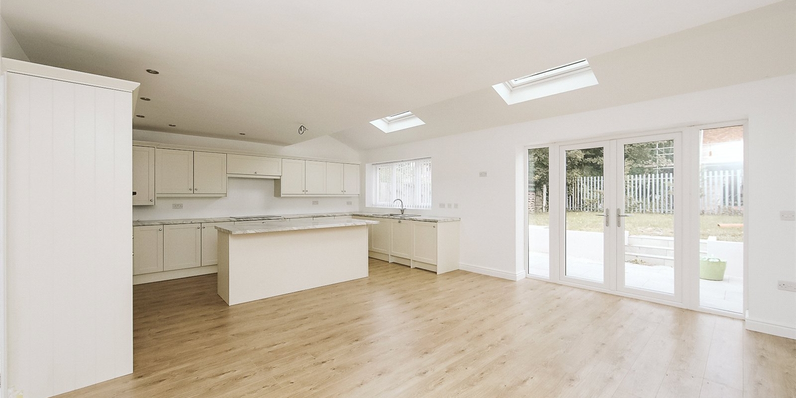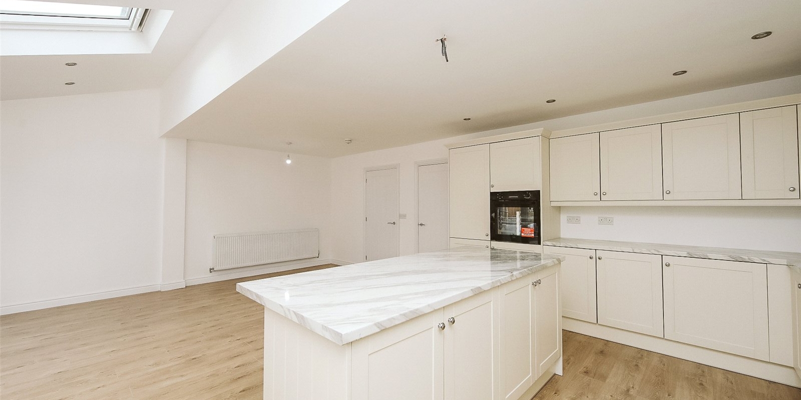 Step inside to a bright and welcoming entrance hall that sets the tone for the rest of the home. At its heart lies a stunning open-plan kitchen, dining, and living area — flooded with natural light thanks to Velux skylights and large windows. The contemporary kitchen features sleek, neutral-toned cabinetry, a central island, and fully integrated appliances, offering a stylish and functional space for everyday living and entertaining.