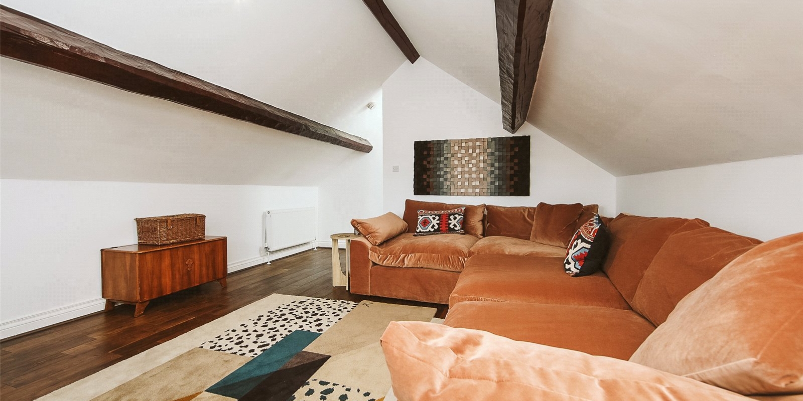 The upper level boasts a uniquely versatile second bedroom featuring beautiful original beams, vaulted ceilings, and stylish wooden flooring. Currently used as an additional lounge area, this room can serve equally well as a guest room, home office, or bedroom—tailored to suit your lifestyle.