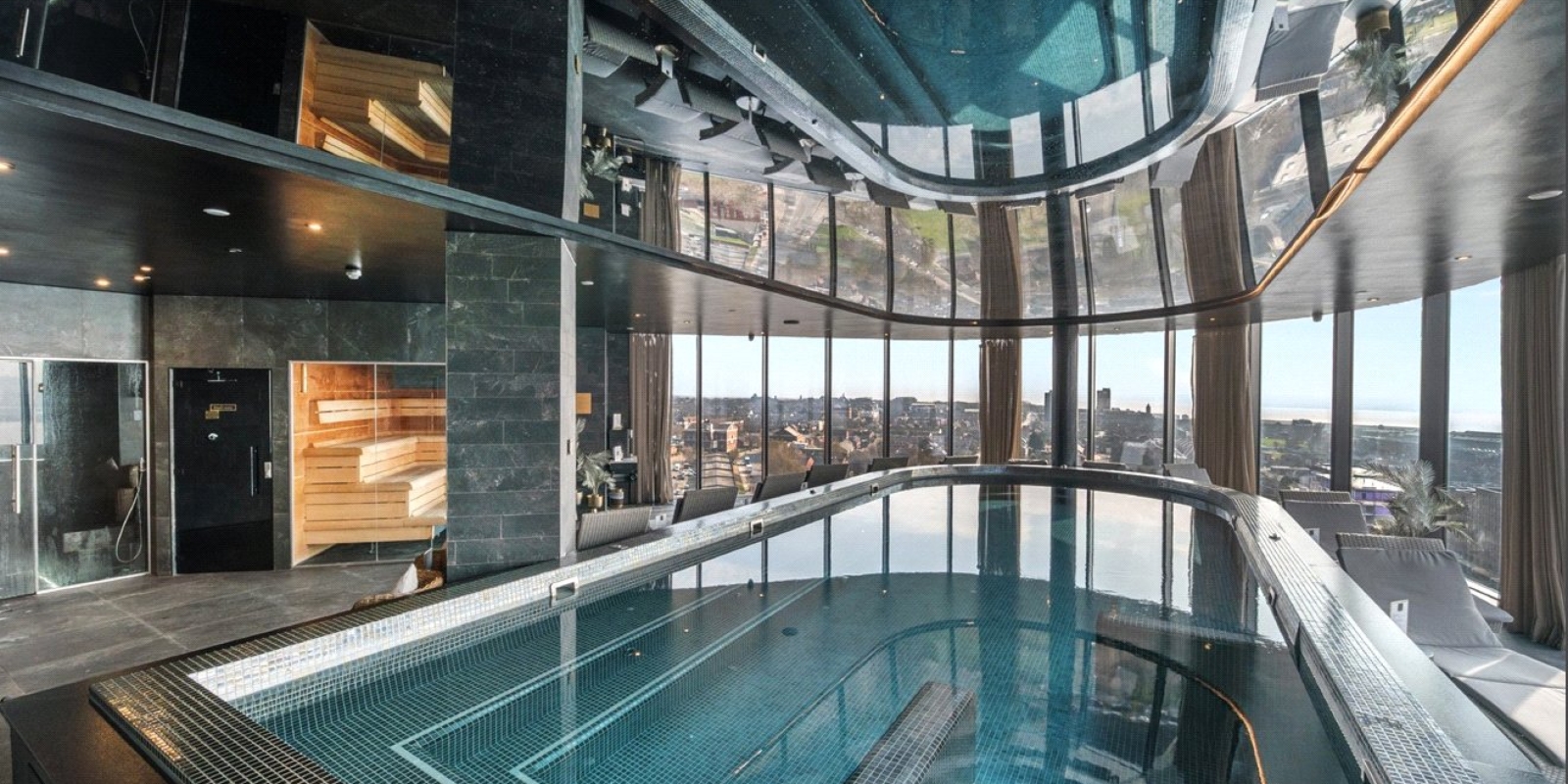 The apartment features eco-friendly technology, premium finishes, and floor-to-ceiling windows offering stunning views across the Liverpool skyline.