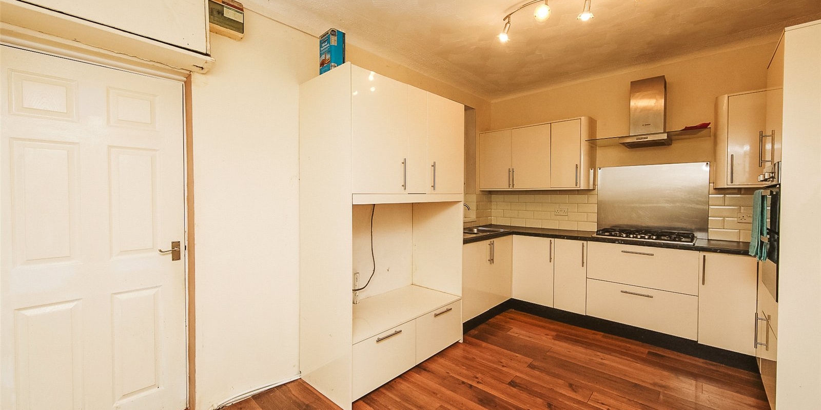 At the heart of the home lies the spacious dining kitchen, fitted with a range of matching wall and base units, a double oven, and a five-burner hob. The open-plan layout provides ample room for a family dining table - perfect for everyday living and mealtimes together.