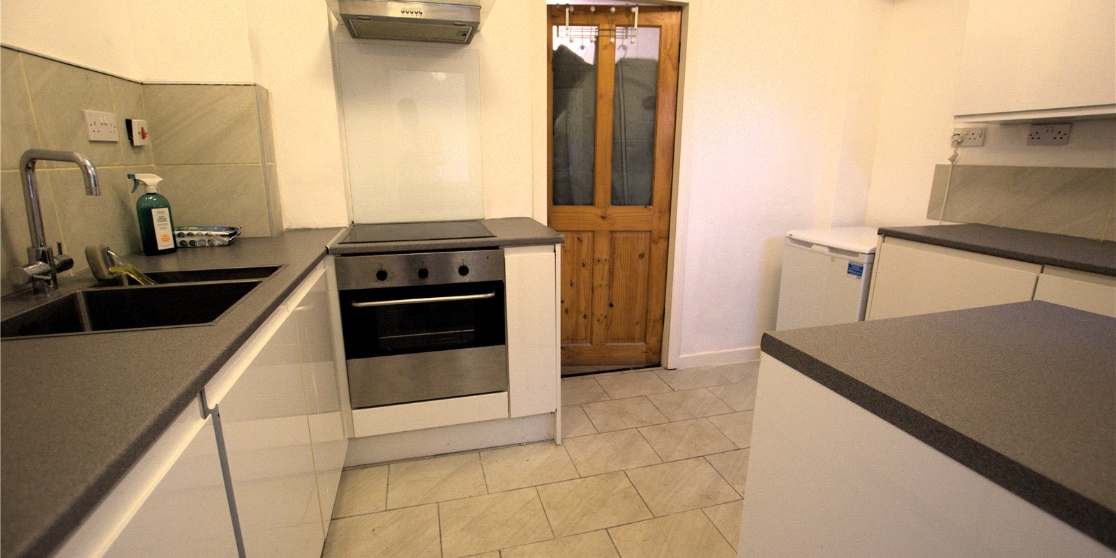 The kitchen is positioned to the rear and provides a functional workspace with direct access to the ground floor amenities. Upstairs, the property features two well-proportioned bedrooms—one large double and a second spacious single—both offering natural light and versatile layout options. A three-piece bathroom completes the first floor, with a compact yet efficient design.