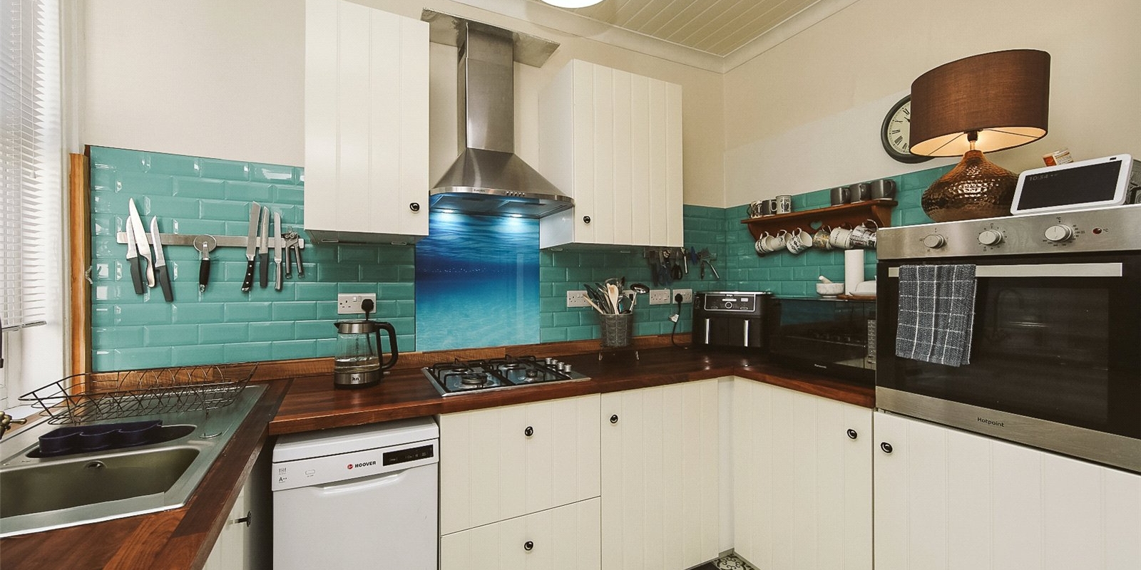The modern kitchen features ample worktop and cupboard space, integrated appliances, and underfloor heating. A connecting door from the dining room leads to a small utility area.