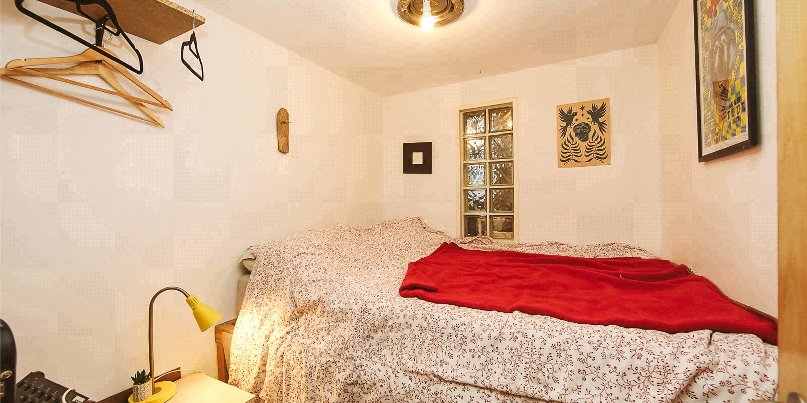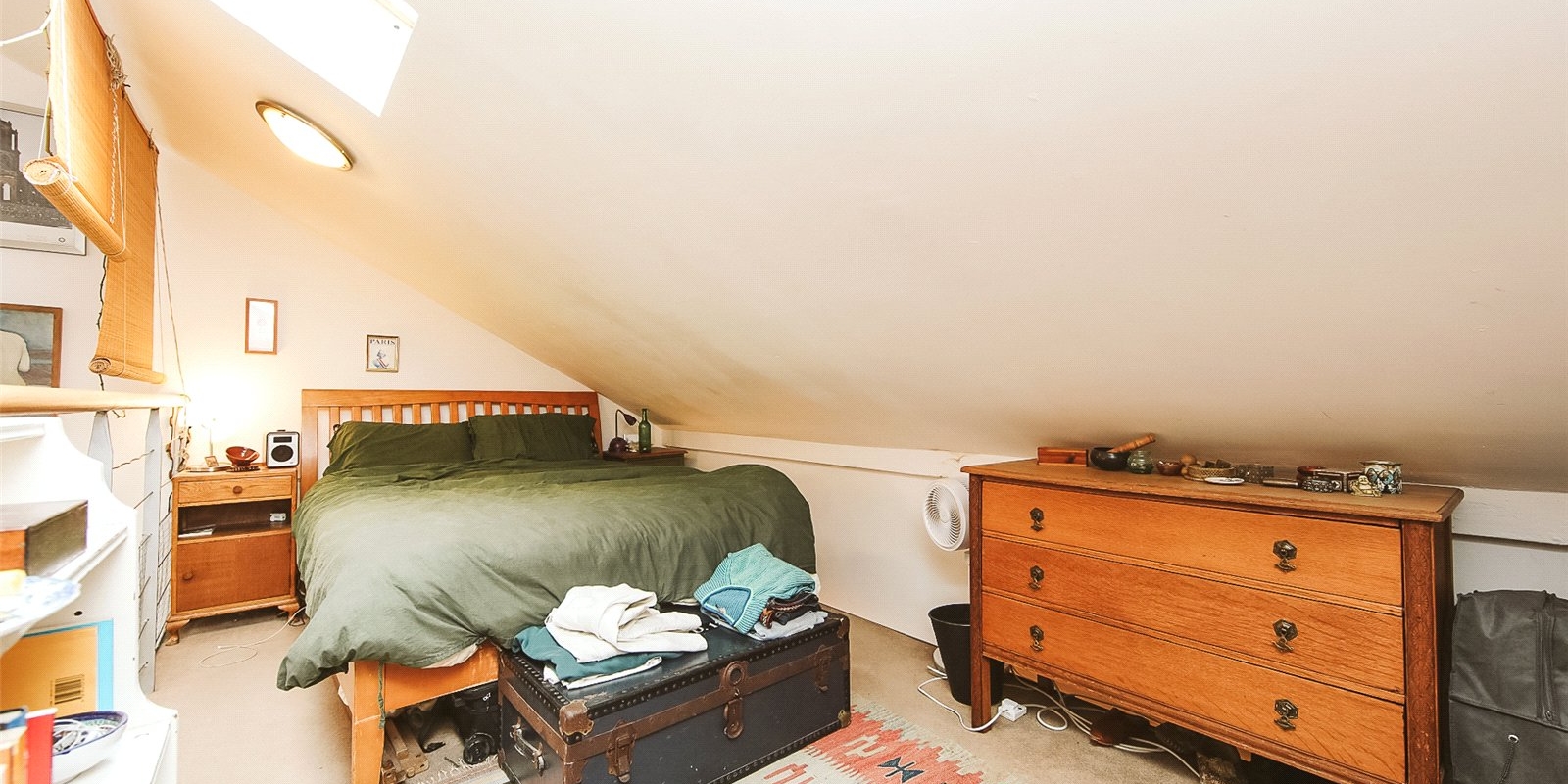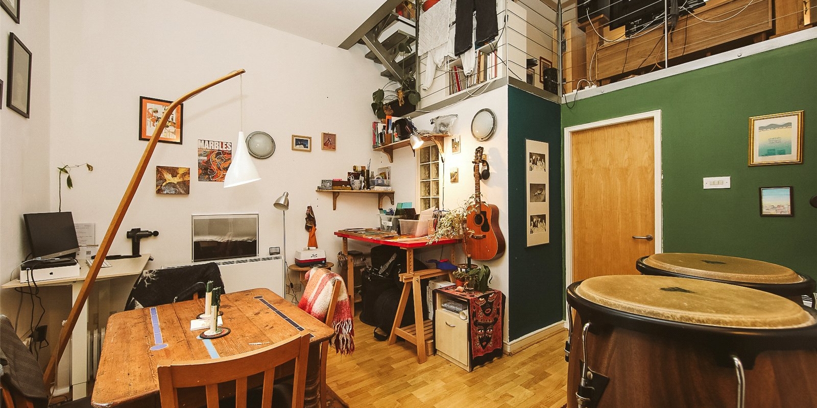 The second bedroom is a mezzanine set within the top of the block, looking over a large multi-functional reception room. The kitchen has plenty of storage and space for food preparation. The primary living room opens out onto a balcony space, perfect for enjoying a coffee in the mornings.
