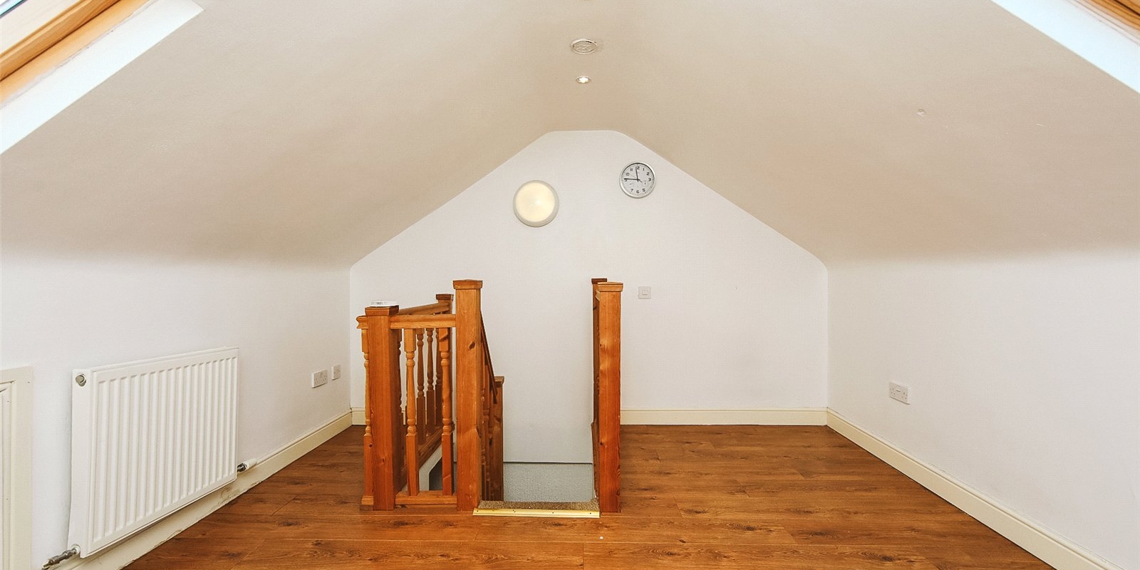 The ground floor features a welcoming hallway leading to a spacious lounge and a separate dining room. The kitchen provides a functional workspace and room for appliances, with scope to update to personal taste. Upstairs, two good-sized bedrooms are complemented by a split bathroom and WC. The converted attic room offers additional versatile space, perfect for a study, hobby room, or extra storage.