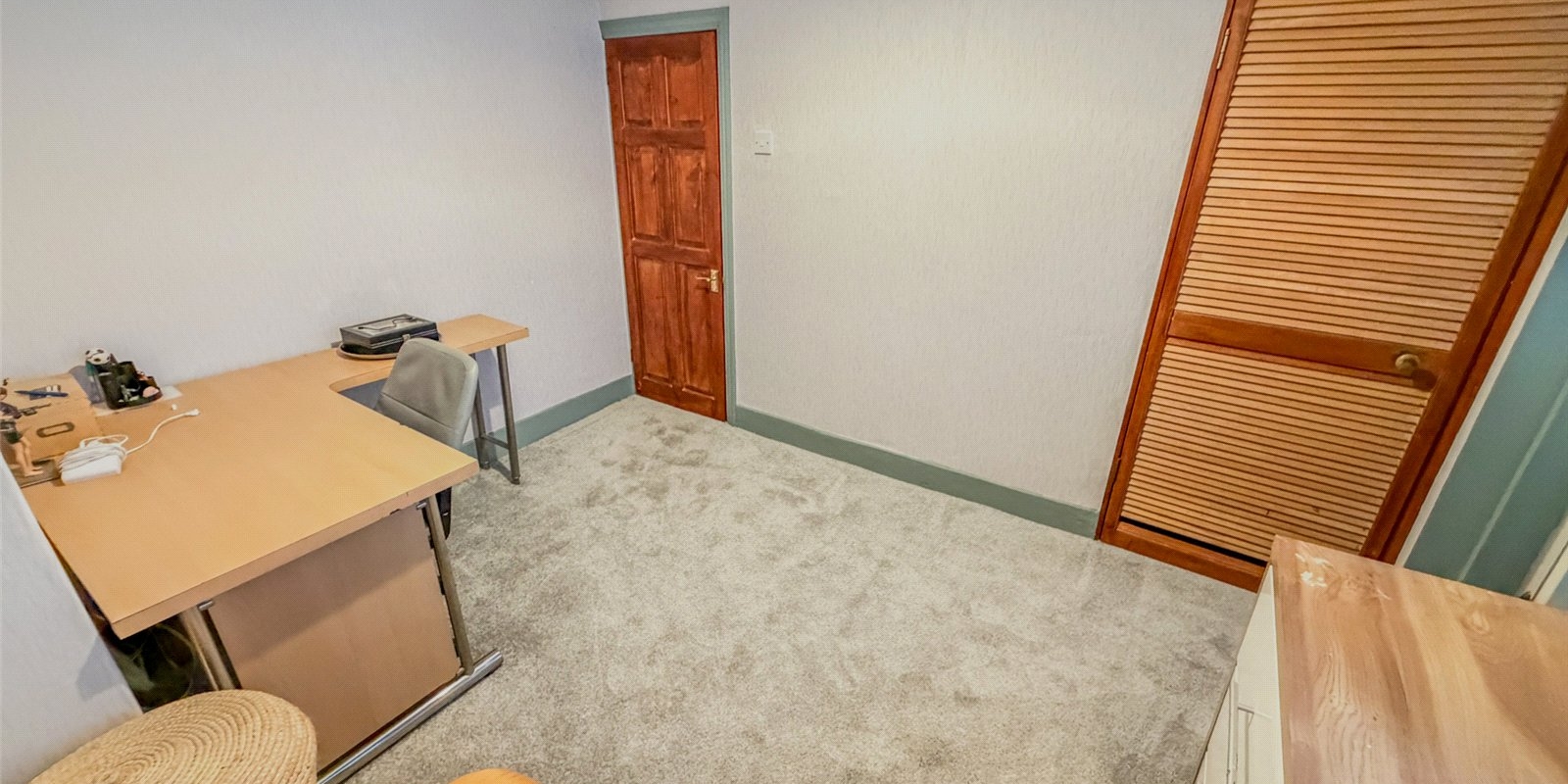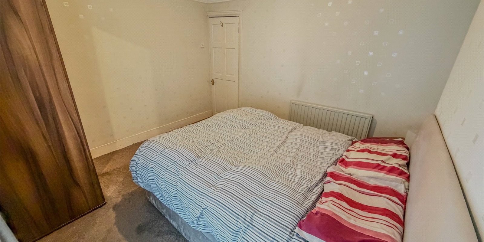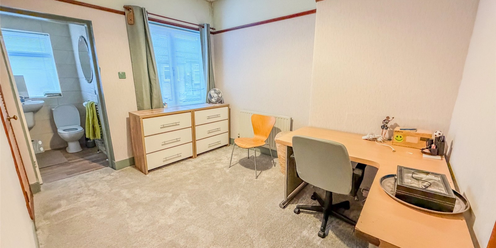 Upstairs, the property offers two well-proportioned bedrooms, including a generous main bedroom spanning the width of the house, and a second double bedroom ideal for guests, a home office or additional storage. A three-piece bathroom completes the first floor. The interiors are straightforward and functional, giving buyers a solid base with clear potential to personalise or update over time.