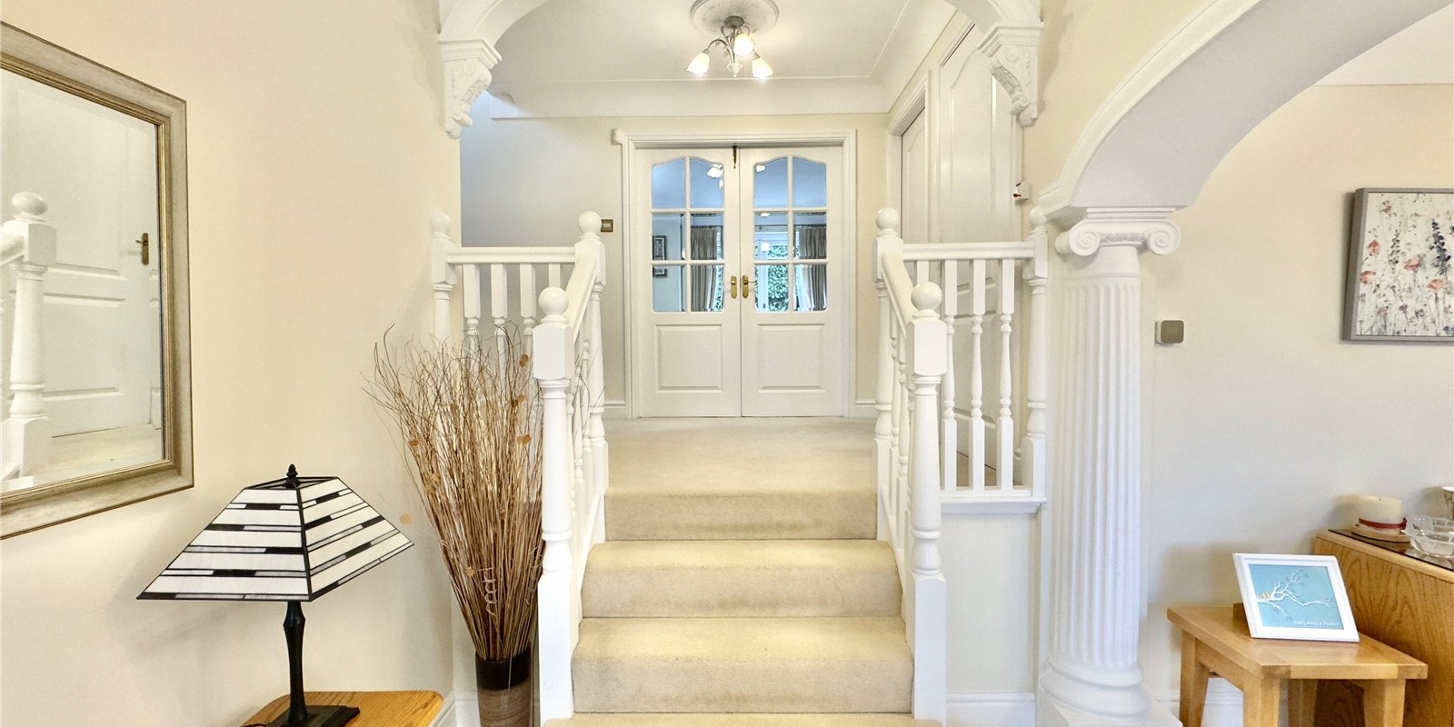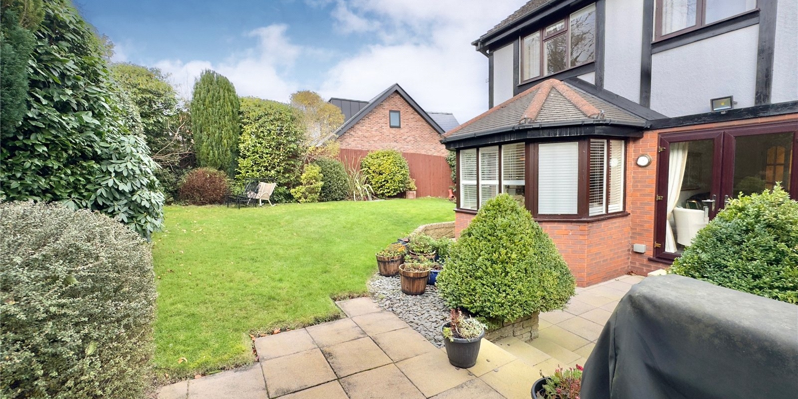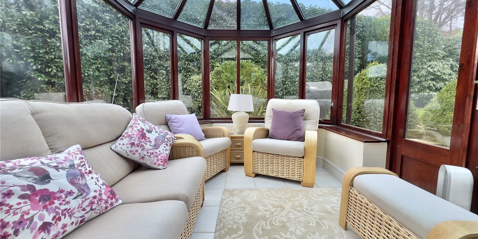 The property enjoys wrap-around gardens, including a sweeping south-facing lawn, a raised decked area with glass balustrade, and a paved patio, all beautifully framed by mature planting. There is ample off-road parking for multiple vehicles and a detached double garage.