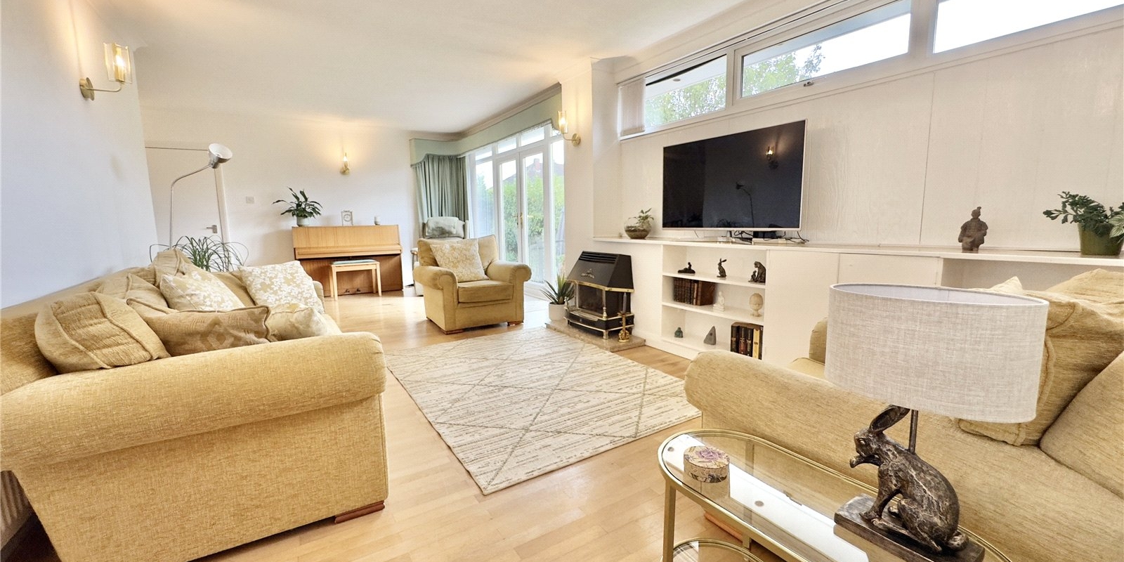 The property boasts some notable features, including a sprung birchwood floor and a three-phase electricity supply. Externally, the home is surrounded by wrap-around gardens and offers a spacious driveway with off-road parking for multiple vehicles.