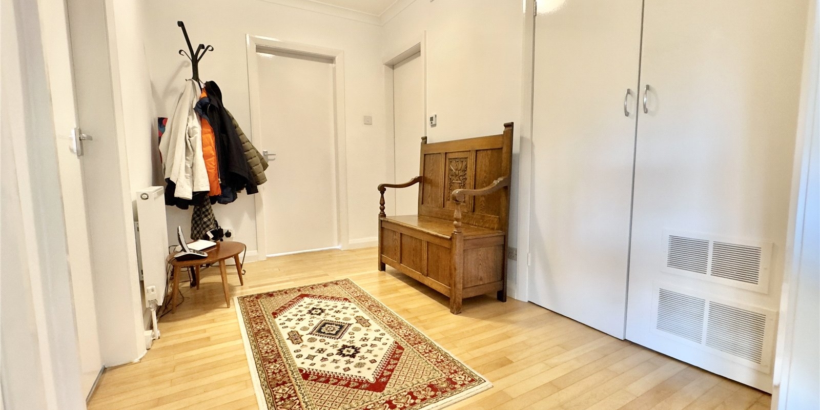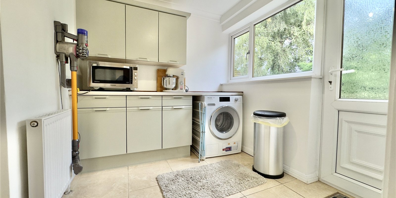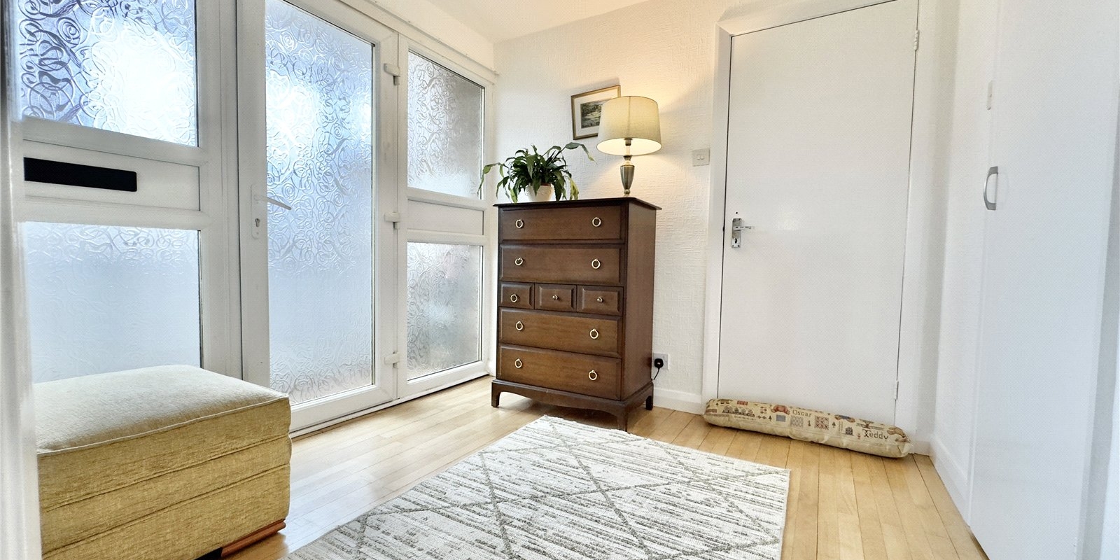 To the opposite side of the bungalow, a second hallway gives access to three generously sized double bedrooms, all of which feature built-in wardrobes. This area also includes two useful storage cupboards and a large four-piece family bathroom.