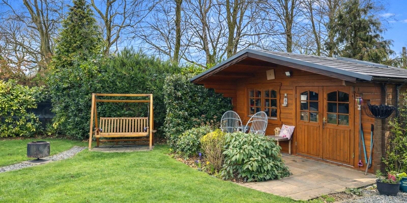 Externally, the property sits within stunning wrap-around gardens that have been thoughtfully landscaped and maintained. The outdoor space features a charming pond, well-stocked flower beds, a pavilion, and a well-built wooden cabin, creating a peaceful setting ideal for relaxing or entertaining.