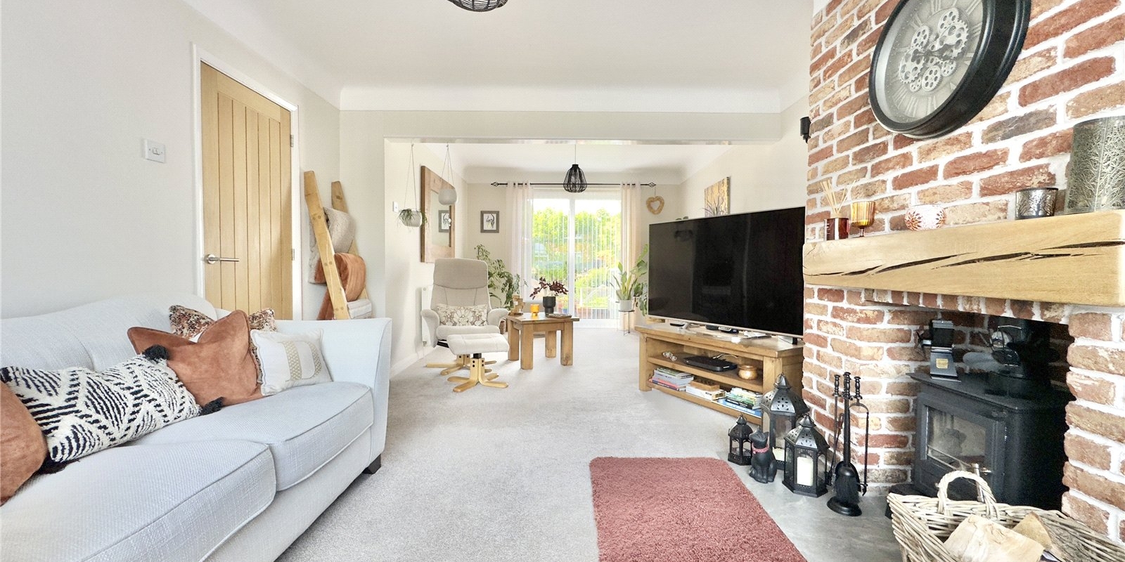 Upon entering, you’re welcomed by a spacious entrance porch leading into a generous hallway. The ground floor features a bright and airy lounge/diner, complete with a charming wood burner and sliding patio doors that open directly onto the sunny, landscaped rear garden. The modern kitchen/diner is thoughtfully designed, perfect for both everyday living and entertaining. Just off the kitchen is an outdoor utility room that conveniently connects the main house to the garage.
