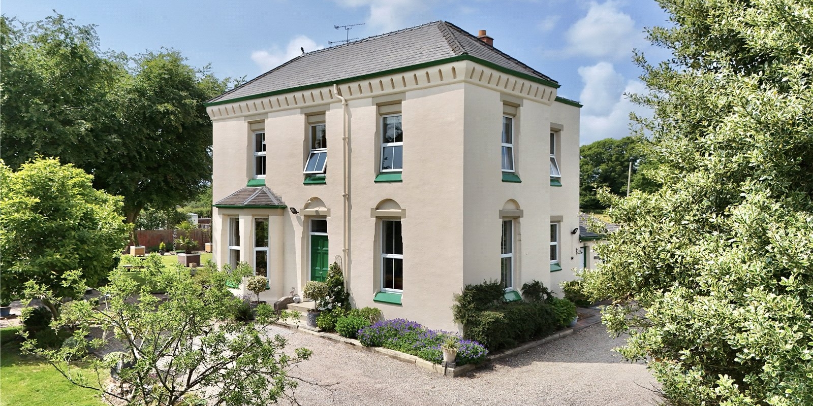 Occupying an impressive 1.17-acre plot (approx. 51,000 sq. ft.), this exceptional Georgian detached property enjoys a secluded position within the sought-after rural surroundings of Childer Thornton, Cheshire. Accessed via two sweeping driveways with automated gate access, the home is set back behind expansive lawned gardens with mature trees and a charming orchard area, all beautifully landscaped to create a truly stunning setting.