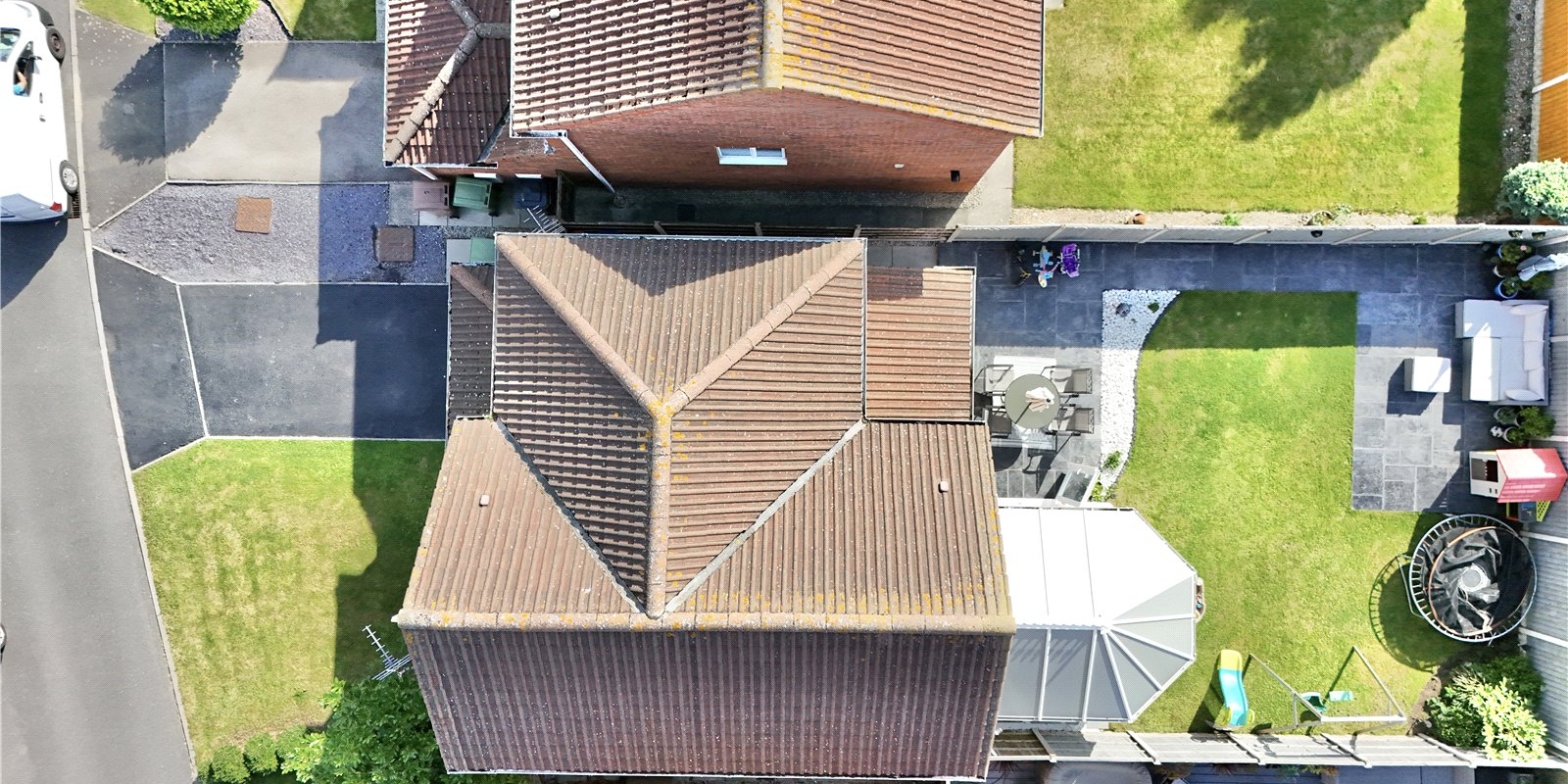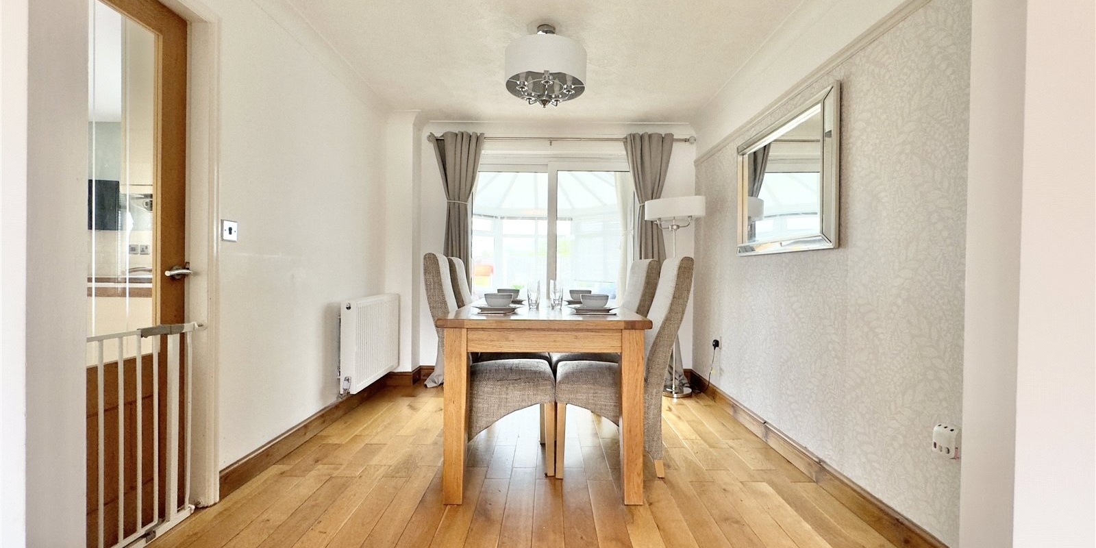 As you approach, a welcoming driveway leads to the front door, which opens into a spacious entrance hall. The bright and inviting lounge is located at the front of the property, bathed in natural light from a front-facing window. The lounge seamlessly connects to the adjoining dining room, perfect for entertaining, with sliding patio doors leading to the conservatory. The conservatory offers panoramic views and access to the lovely rear garden.