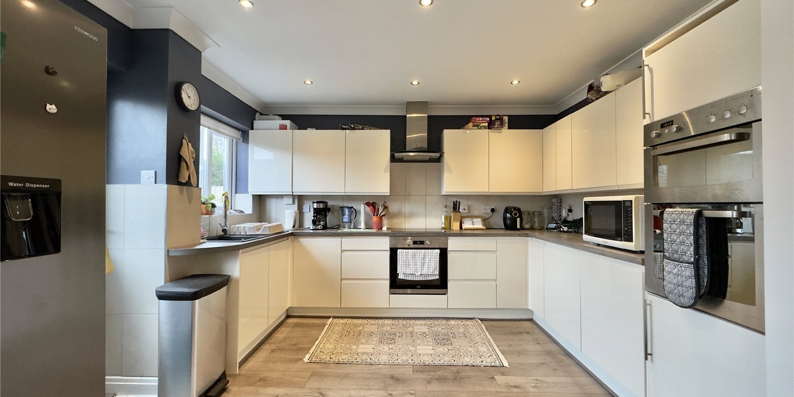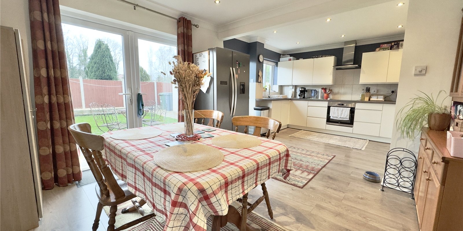 The ground floor accommodation begins with a welcoming entrance hall leading into a bright bay-fronted lounge featuring a wall-mounted gas fireplace, creating a comfortable and relaxing living space. To the rear of the property is a generous dining area with French doors opening directly onto the garden, making it perfect for both everyday family use and entertaining. The adjoining modern fitted kitchen includes a range of wall and base units with complementary work surfaces, integrated electric oven and hob with extractor, plumbing for a washing machine and access to the rear garden.