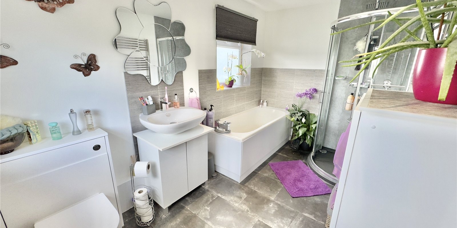 Upstairs, you'll find three well-proportioned bedrooms, all decorated with a stylish design and offering plenty of space for beds, wardrobes, and desks. The impressive family bathroom is a standout feature, boasting a modern suite with both a bathtub and a separate walk-in shower—ideal for busy mornings and relaxing evenings alike.