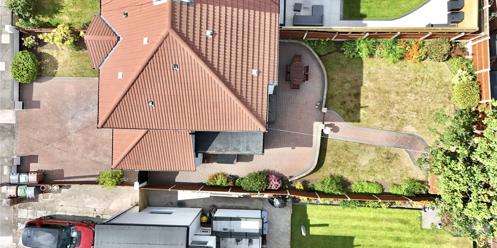 Outside, the property features a generous block-paved driveway with parking for multiple vehicles and access to the garage. The front garden includes a neat lawn with well-stocked borders, while the rear garden offers a peaceful retreat with a block-paved patio, pathway, two lawned areas, mature planting, and full wooden fencing—an ideal space for outdoor dining, play, or simply relaxing in the sunshine.