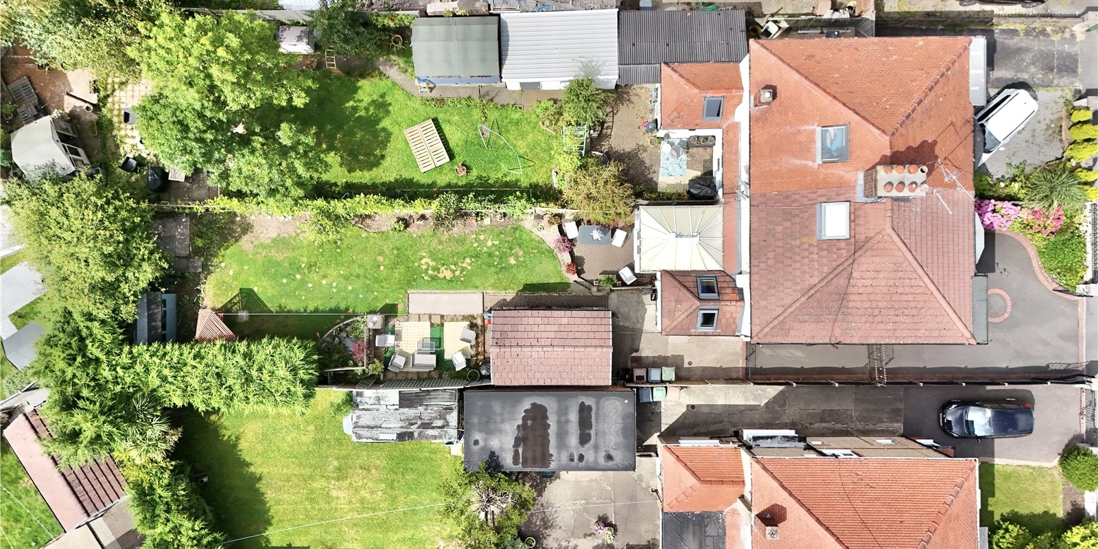 Downstairs, the spacious ground floor is arranged to accommodate three separate reception areas, allowing for flexible use as formal living and dining rooms, a playroom, study, or family lounge. These spaces are ideal for both everyday living and entertaining. At the rear of the property, the kitchen enjoys views over a mature and expansive garden, a haven for those who enjoy outdoor living or gardening. With plenty of space for relaxation, recreation, or even future development, the garden offers privacy and peace, making it a real highlight of the home.
