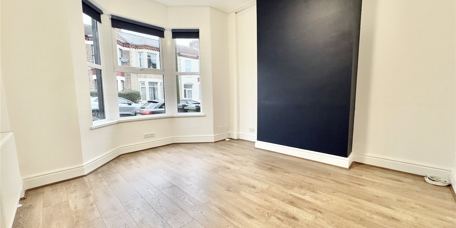 On entering the property you are welcomed into a bright hallway showcasing high ceilings and contemporary décor. The front lounge features a large bay window allowing natural light to flood the room, complemented by a striking navy feature wall. The hallway is open to a stylish fitted kitchen finished with navy cabinetry, contrasting white worktops and a grey splashback. This space opens seamlessly into the dining area, continuing the coordinated colour scheme with another navy feature wall. The open-plan layout is enhanced by multiple windows, creating a light and airy space perfect for both everyday living and entertaining. The rear courtyard is accessed directly from the kitchen.