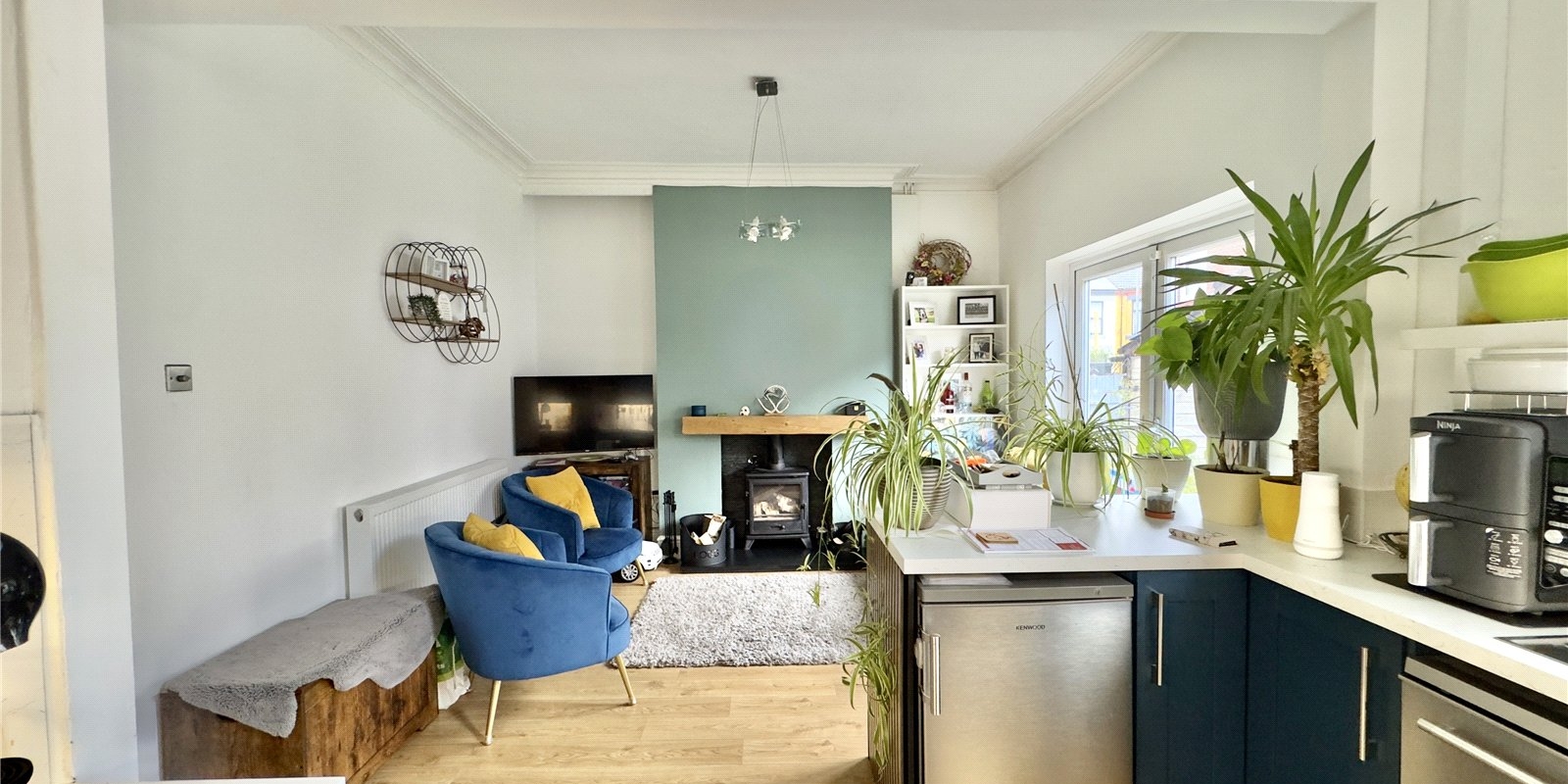 At the heart of the home is the showstopping open-plan living kitchen, thoughtfully designed for modern family living and entertaining. Featuring striking deep navy shaker-style cabinetry paired with marble-effect worktops, this impressive space is both practical and visually stunning. The kitchen includes dedicated space for a dishwasher and under-counter fridge and freezer, while the adjoining dining/living area is warmed by a charming log burner, creating a cosy atmosphere for family meals. Patio doors open directly onto a generously sized courtyard garden, allowing natural light to flood the room and creating a seamless indoor–outdoor flow.