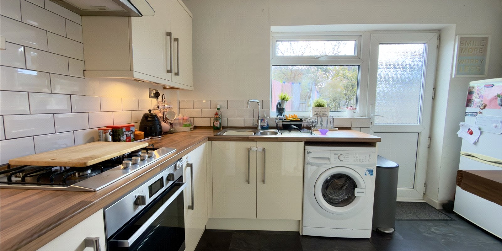 The ground floor offers a welcoming living room, providing a comfortable and relaxing space to unwind. To the rear, a well-equipped kitchen delivers a practical layout with a modern touch, ideal for everyday use.