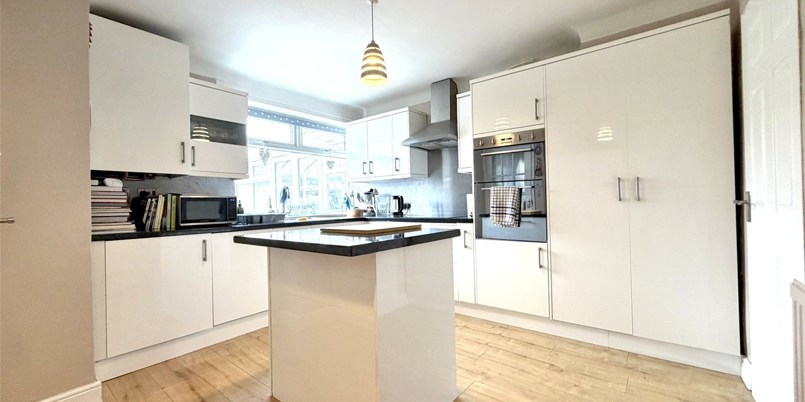 The property is approached via a driveway providing off-road parking for several vehicles, along with a garage. Internally, the accommodation begins with an entrance porch leading into a welcoming hallway. The ground floor boasts a spacious lounge, separate dining room and a large conservatory to the rear, creating excellent versatile living space ideal for entertaining or relaxing with family. The kitchen is fitted with a central island, providing both practicality and a sociable layout, and is complemented by a convenient downstairs WC.