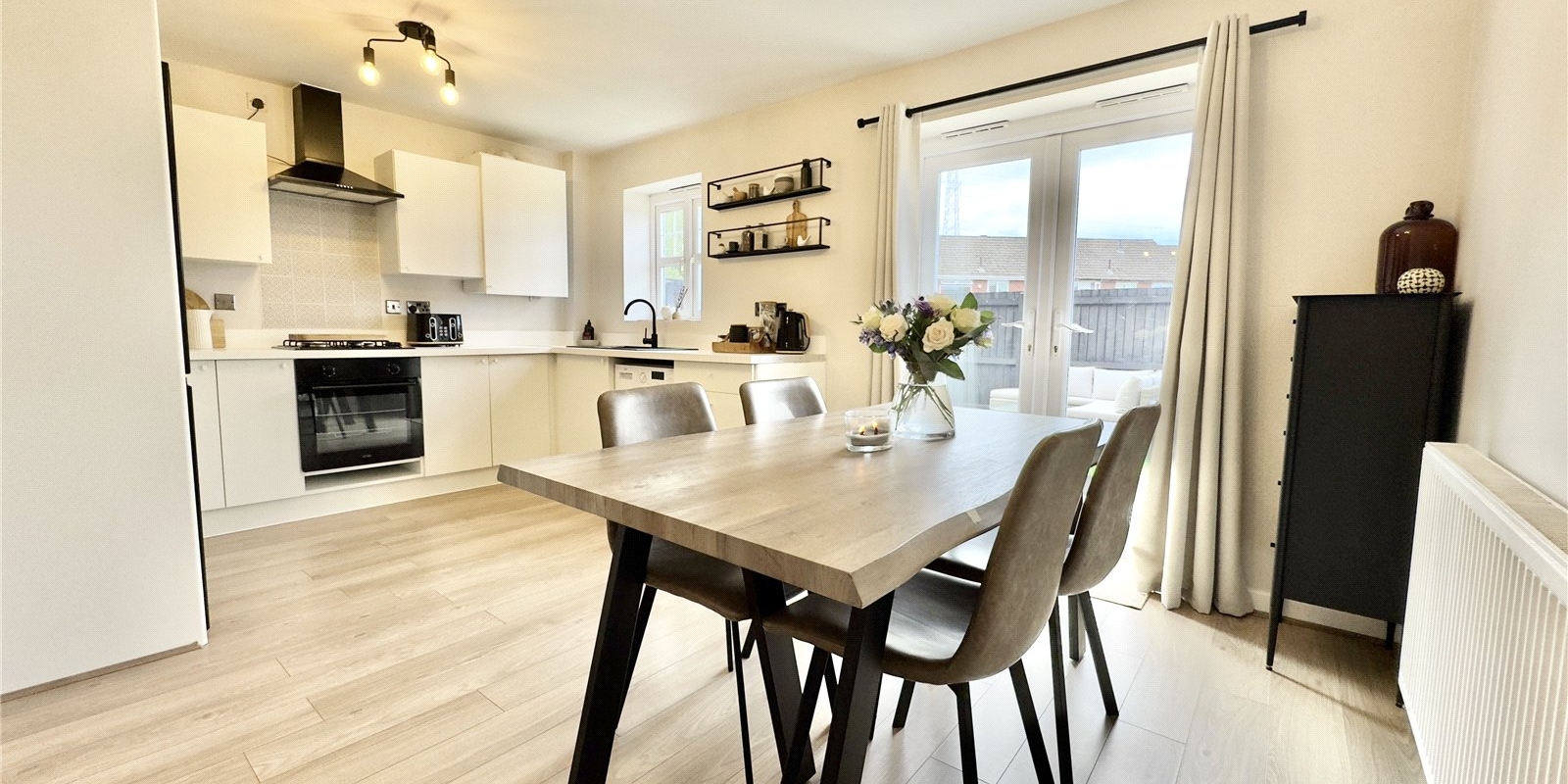 The welcoming entrance hallway leads through to a bright and spacious lounge, while the rear of the property enjoys an impressive open-plan kitchen and dining room, perfect for family life and entertaining alike. There is also a downstairs WC.