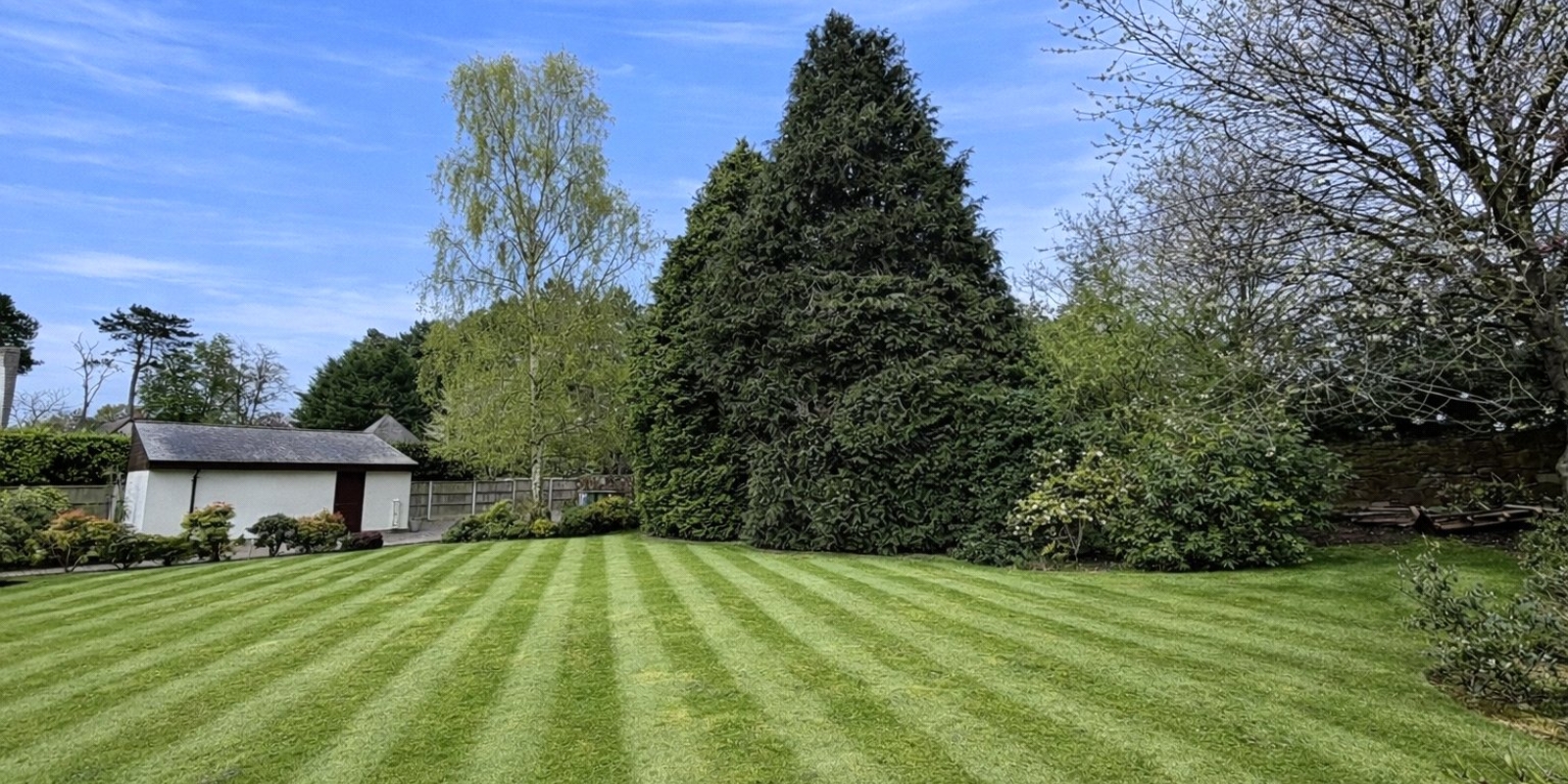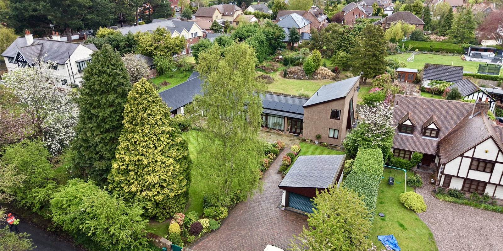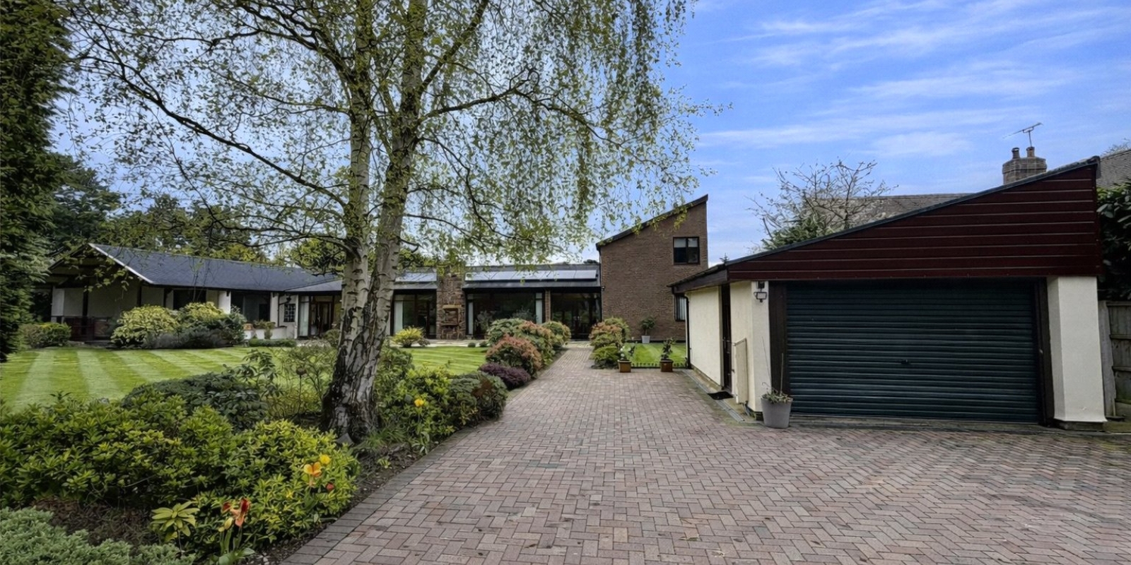 The landscaped front garden offers a tranquil retreat, enhanced by a raised decking area with hot tub.