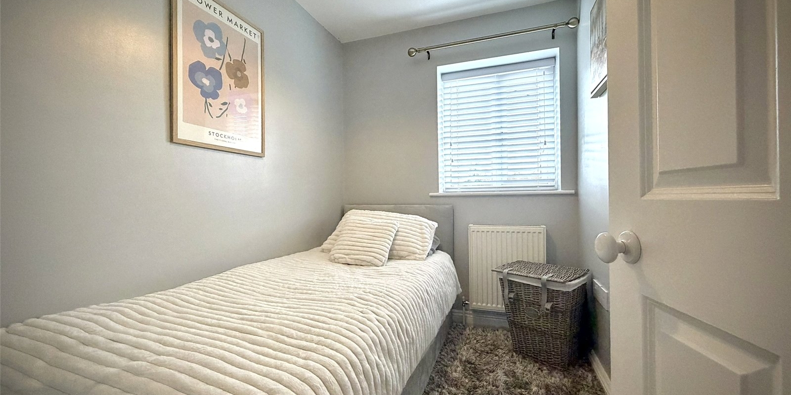 Upstairs, the spacious landing provides access to three well-proportioned bedrooms. The principal bedroom spans the full width of the property and benefits from dual aspect windows overlooking the garden, bespoke fitted wardrobes, and feature acoustic panelling. The second bedroom is a generous double with feature wall, while the third is a well-sized single. A modern family bathroom completes the first floor.