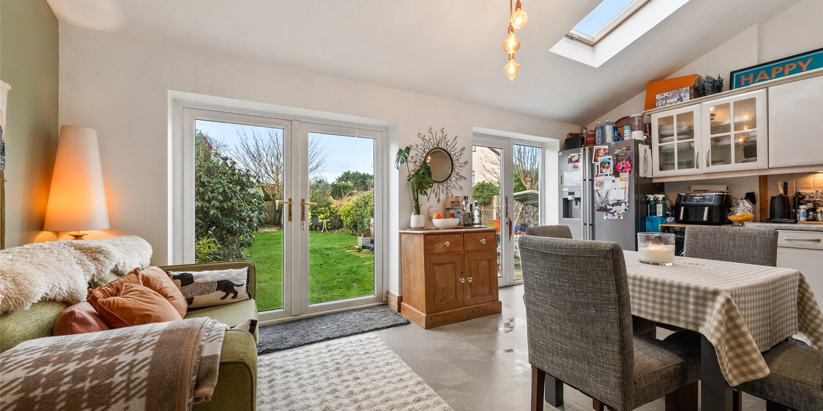 The kitchen is finished in neutral tones, offering a timeless and practical design with ample storage and worktop space. The adjoining dining area benefits from French doors that open directly onto the rear garden, allowing plenty of natural light and creating an excellent indoor-outdoor connection. A useful downstairs toilet adds further convenience.
