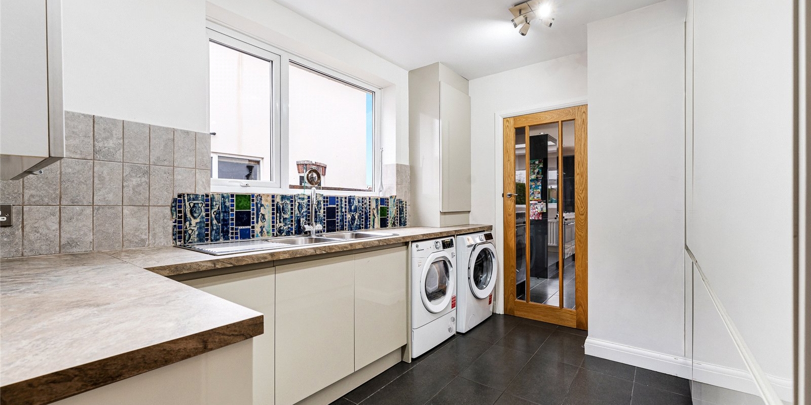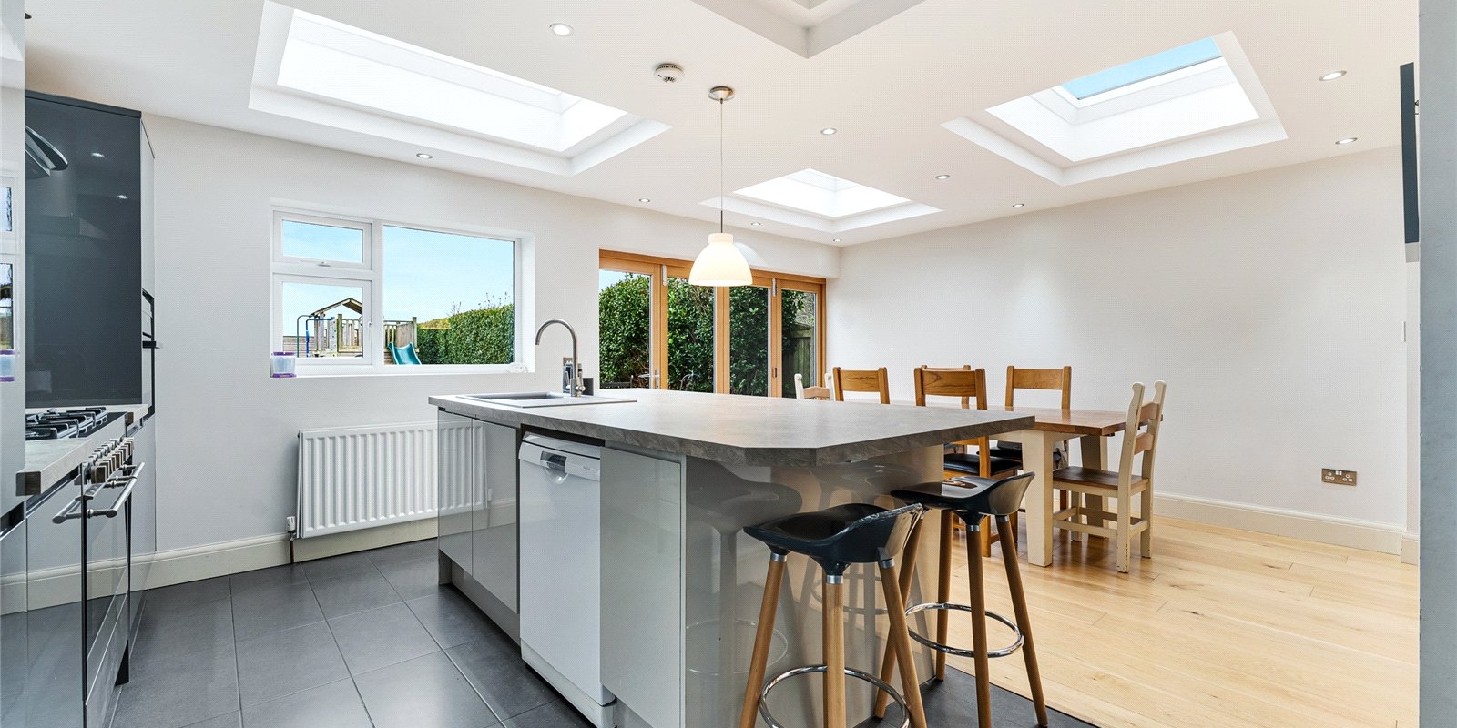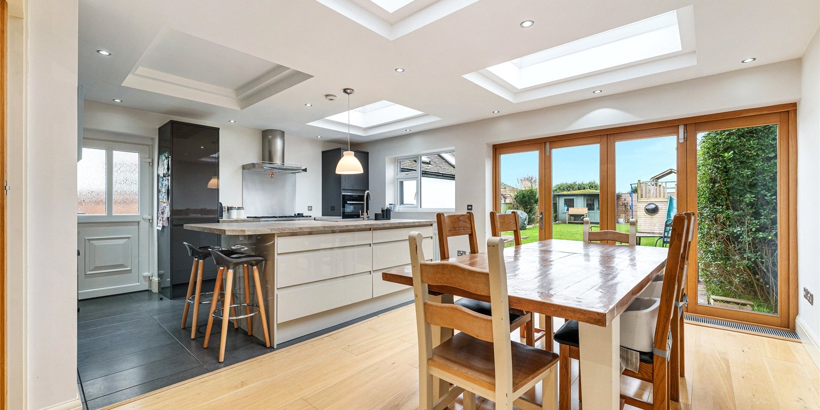 At the heart of the home is the modern kitchen, fully integrated and thoughtfully designed with a central island and ample dining space, ideal for family life and hosting. Bifolding doors which lead to the garden. Additional practical features include a full-size utility room and a stylish downstairs WC.