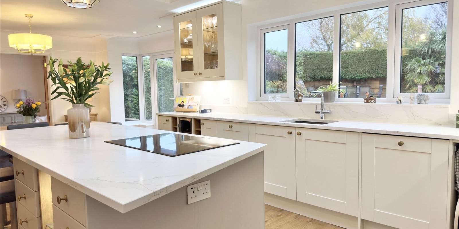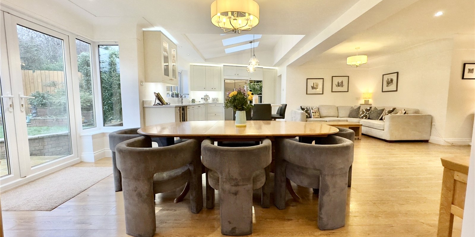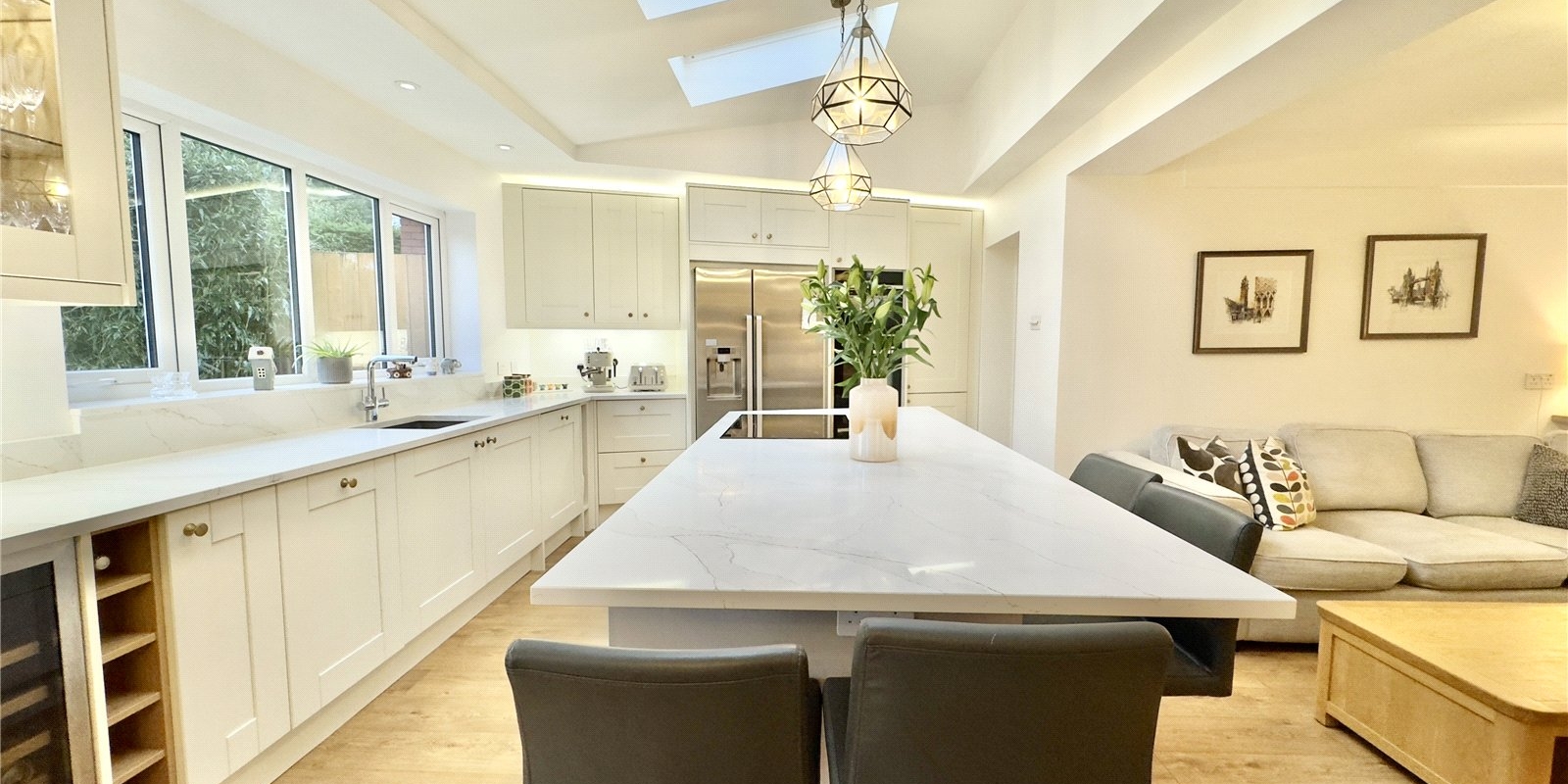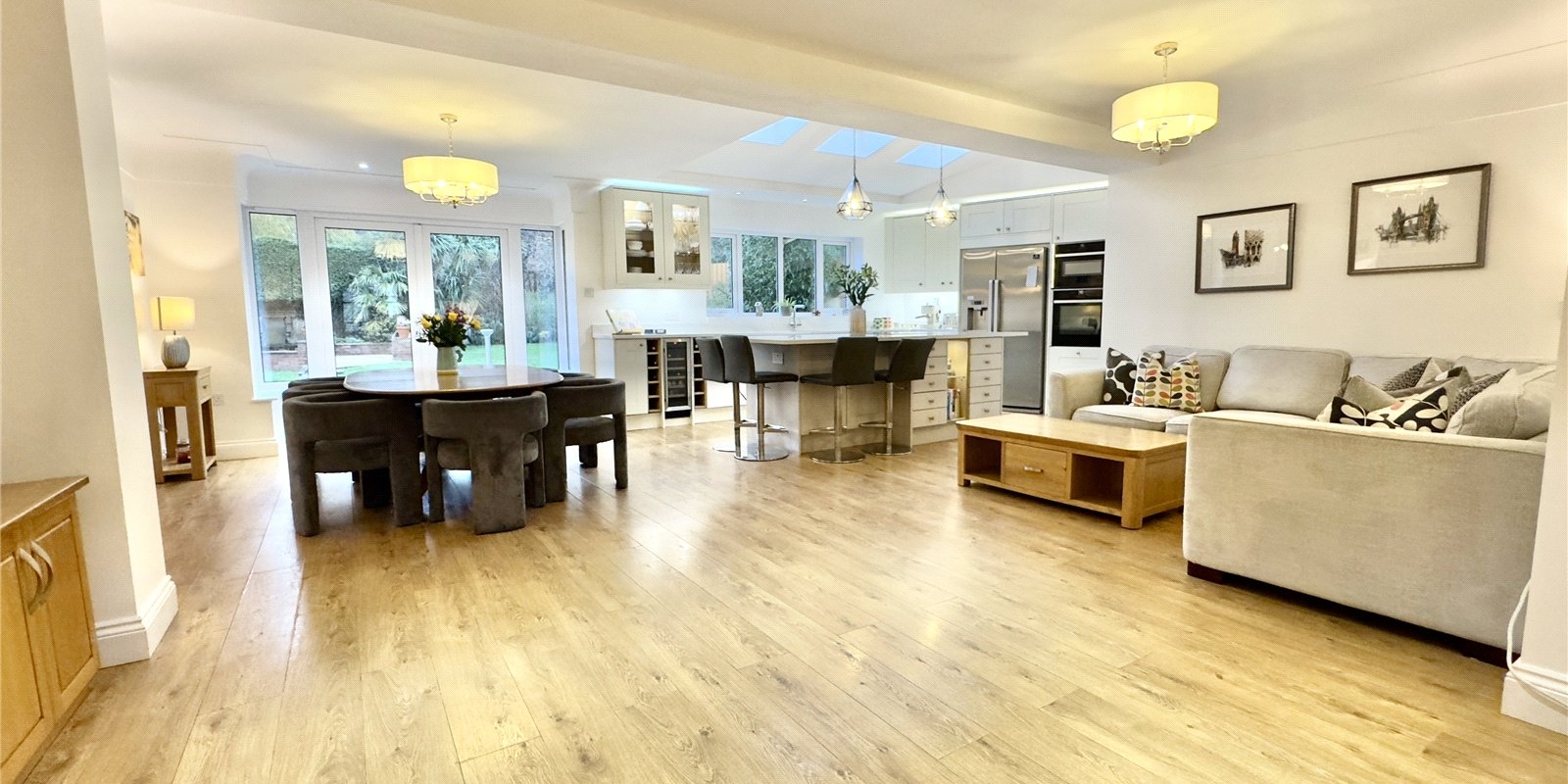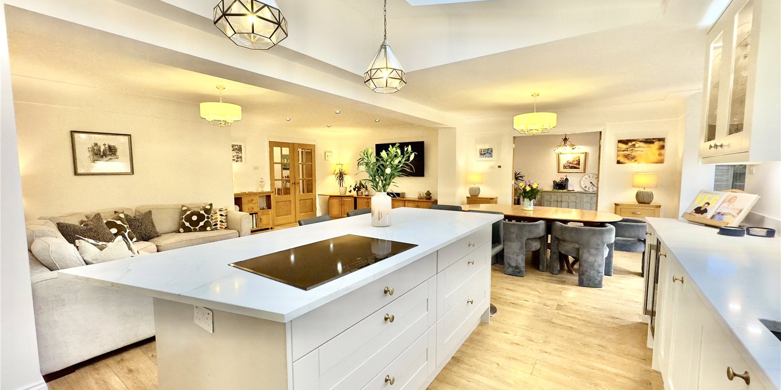 The heart of the home showcases a stunning open-plan kitchen and entertaining area, perfect for family gatherings and dinner parties alike. Additional reception rooms include a dedicated study/office space, comfortable lounge, and separate snug, providing versatility for modern living requirements.