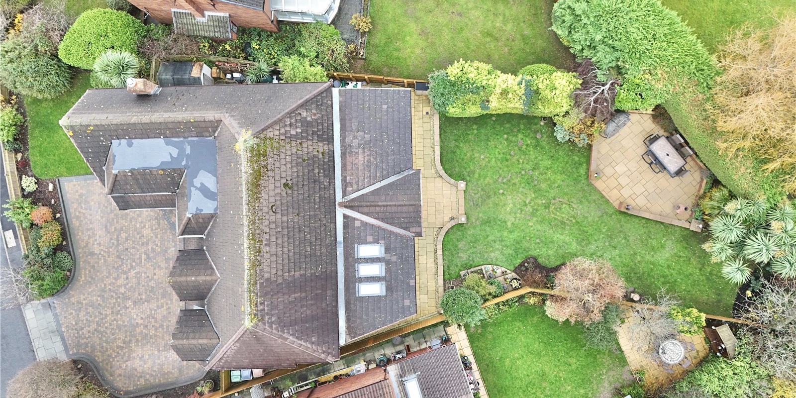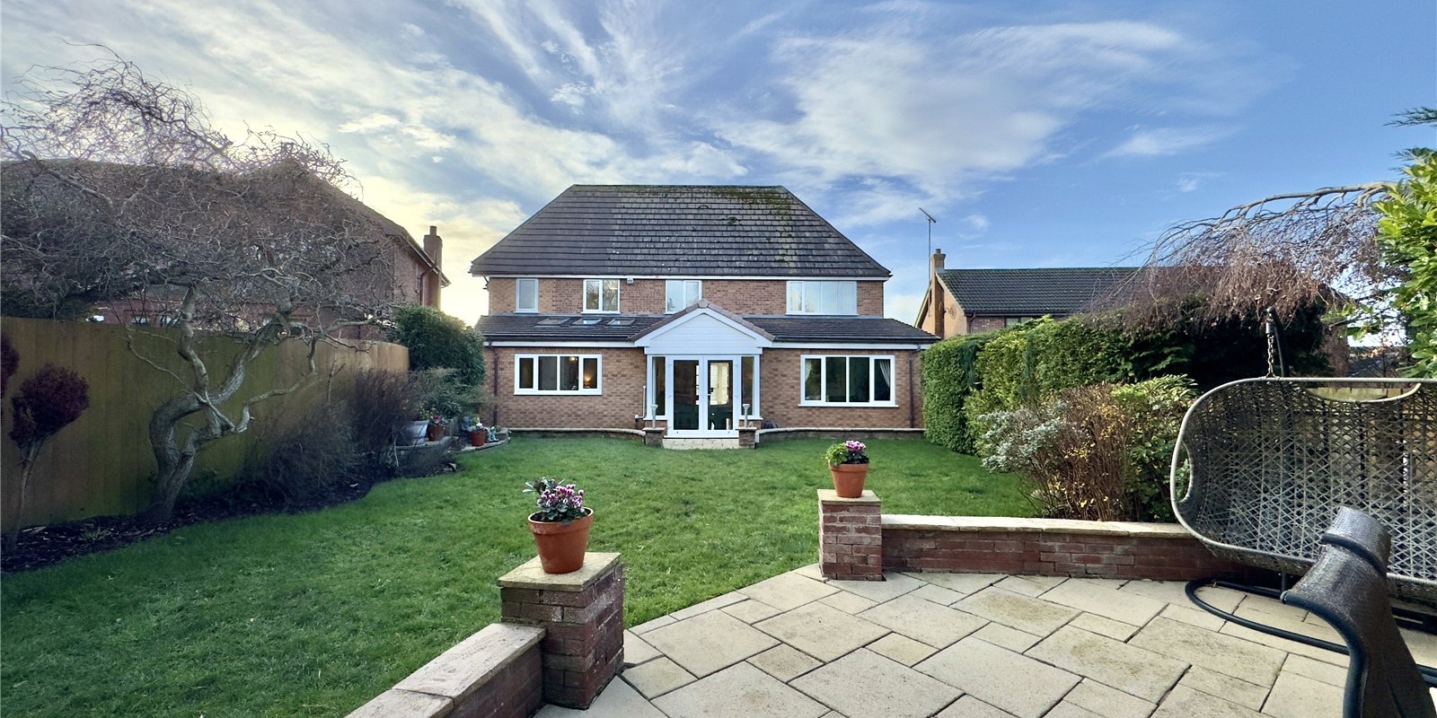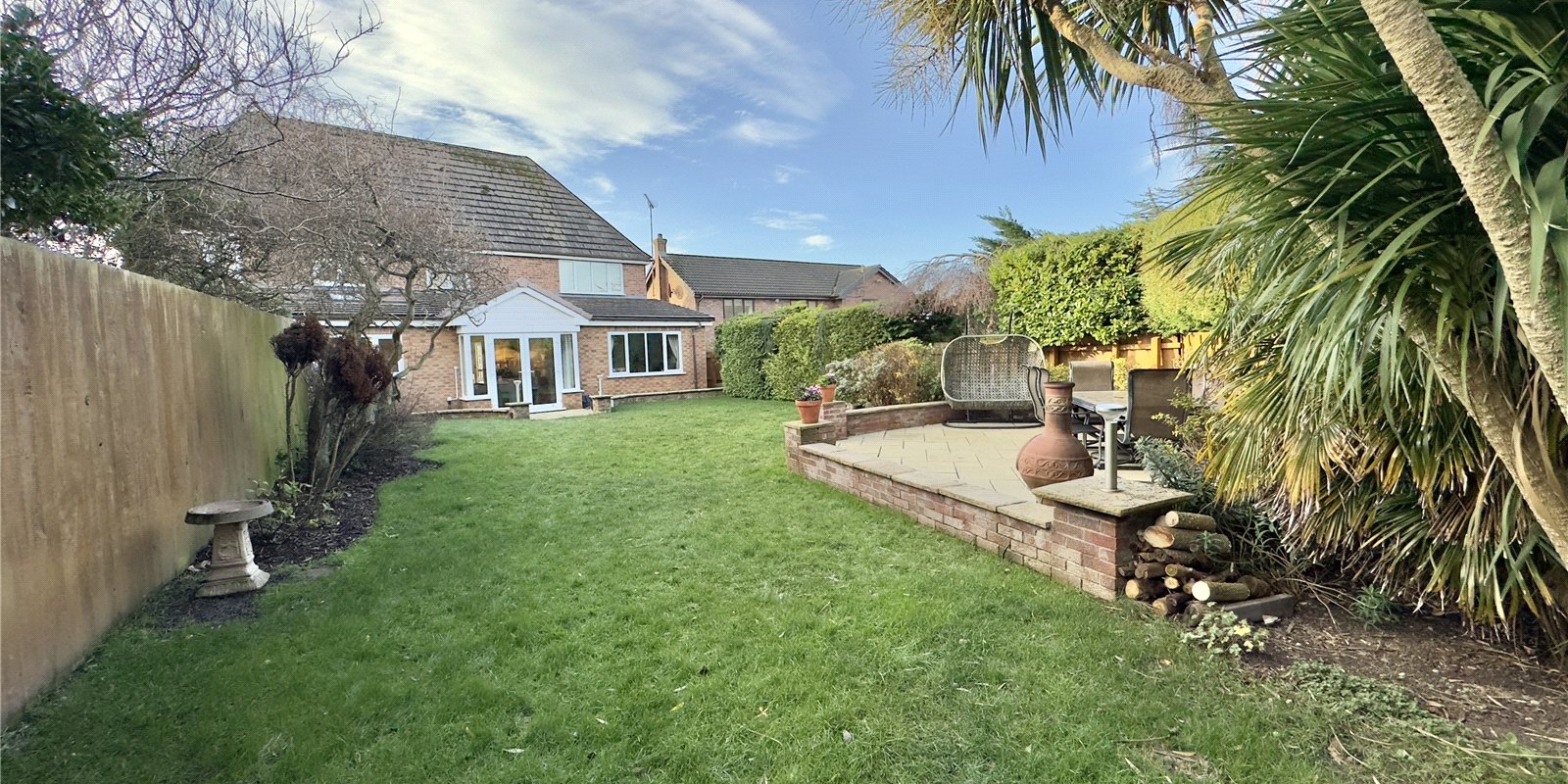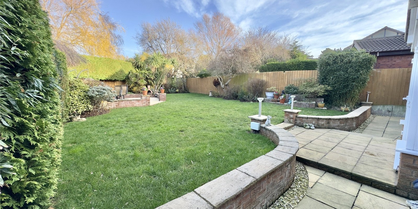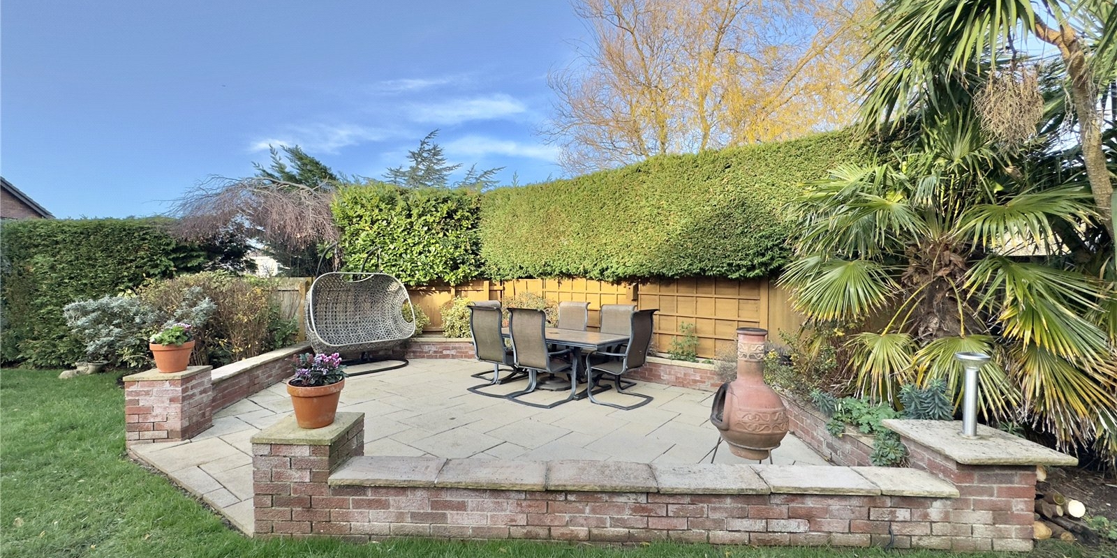 Outside, the mature garden is a particular highlight, featuring well-maintained lawns, established shrubs, and several thoughtfully positioned seating areas. This outdoor sanctuary offers multiple spaces for relaxation and entertainment throughout the seasons.