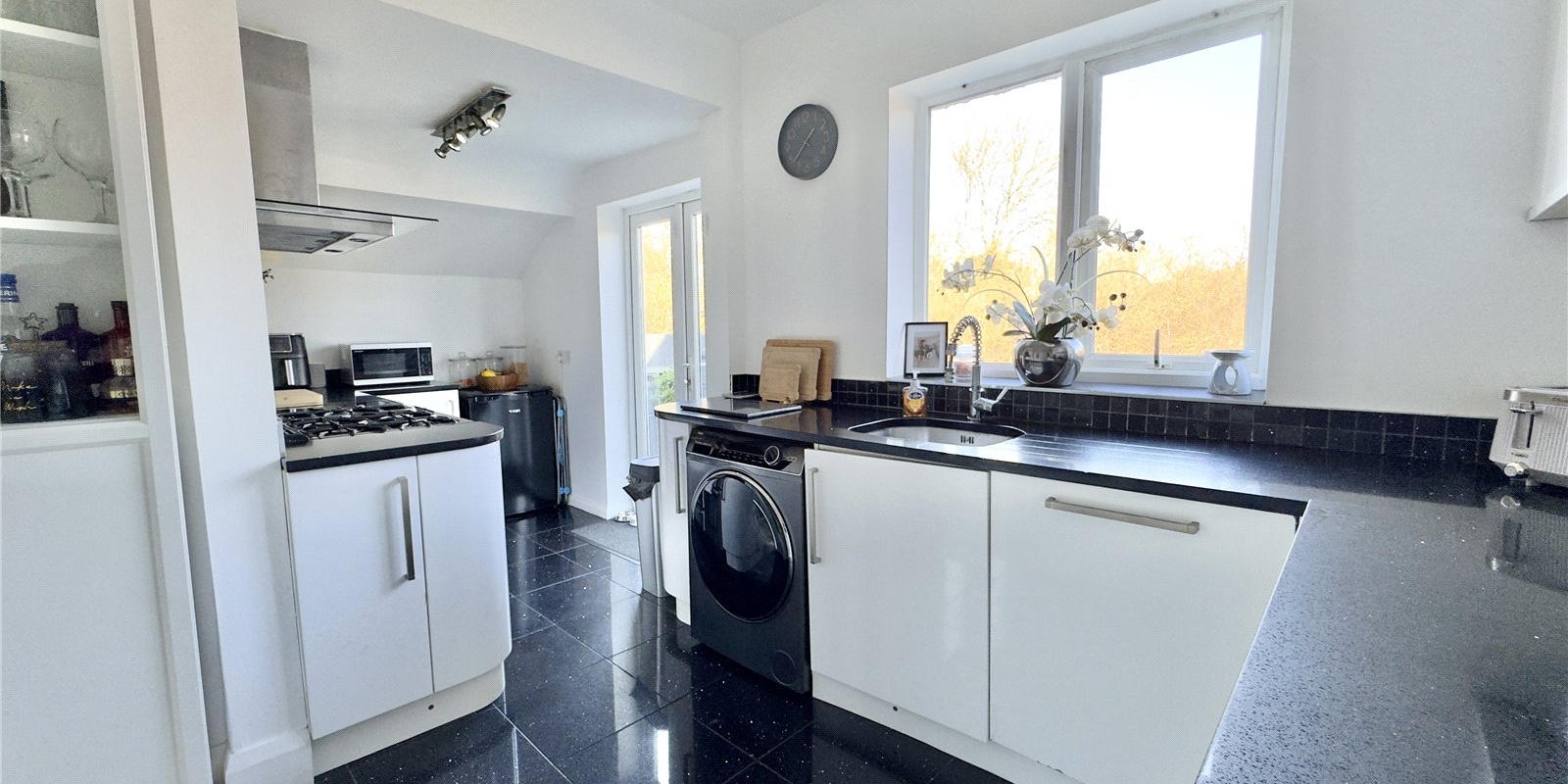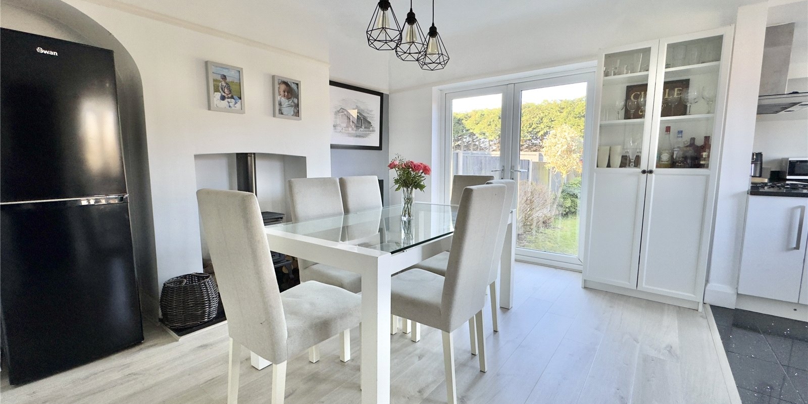 To the rear of the property, the heart of the home unfolds in the stylish kitchen and dining space, complete with wood burning fire. Designed with both everyday living and entertaining in mind, this bright and sociable area enjoys views over the garden, with French doors opening directly onto the decked terrace and seamlessly blending indoor and outdoor living.