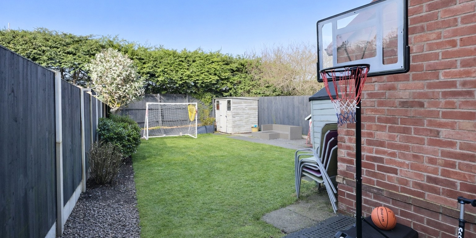 Outside, the rear garden provides a private and peaceful escape. A spacious lawn is bordered by greenery, while the generous decked seating area creates the perfect spot for summer barbecues, morning coffee in the sunshine, or relaxed evenings with friends and family. A timber garden shed offers practical storage, and off-road parking adds everyday convenience.