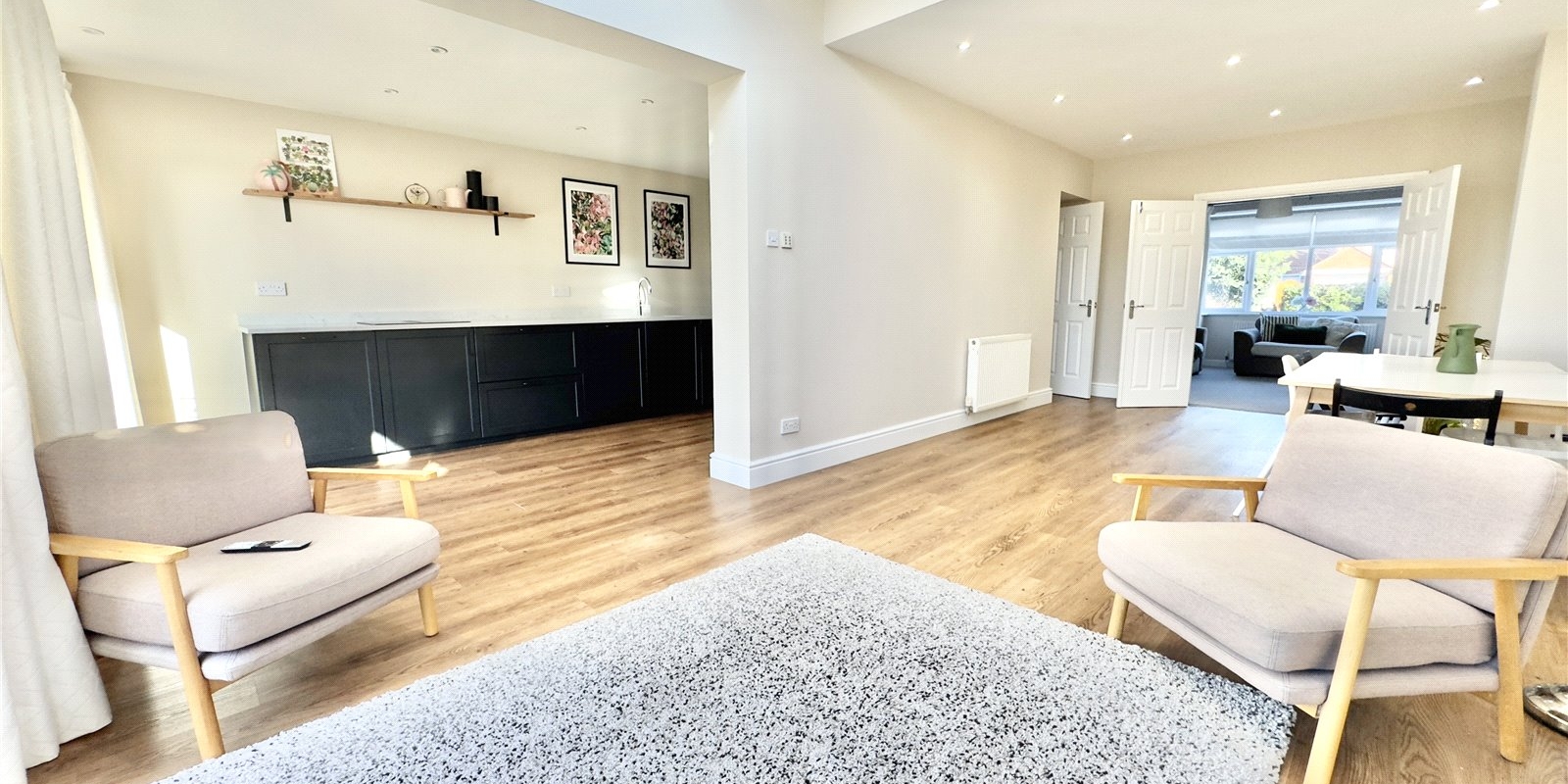 Outside, the large rear garden provides excellent space for relaxation and recreation, whilst ample parking to both front and side ensures convenience for multiple vehicles. The outdoor space truly complements the indoor living areas.