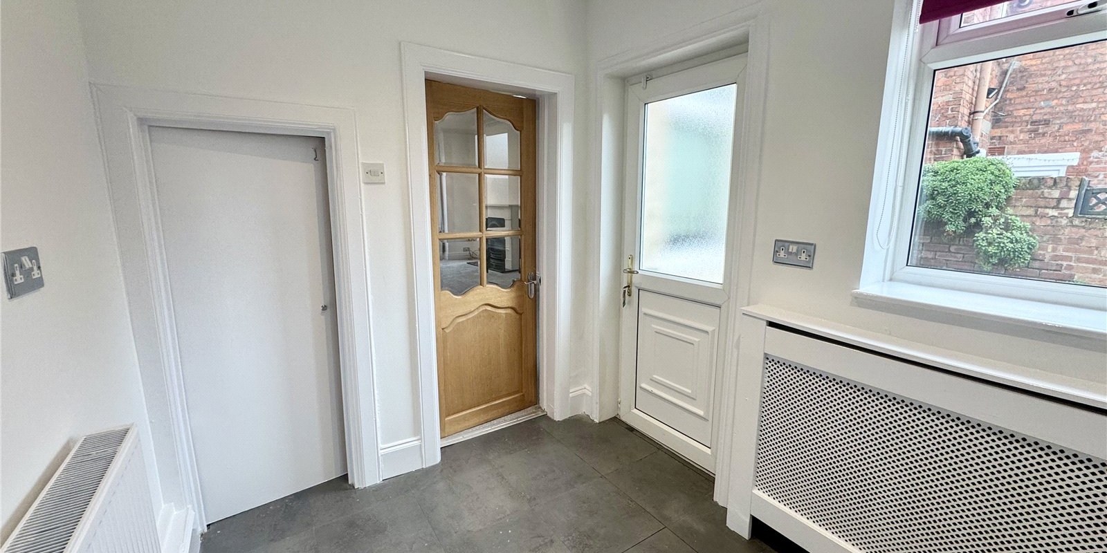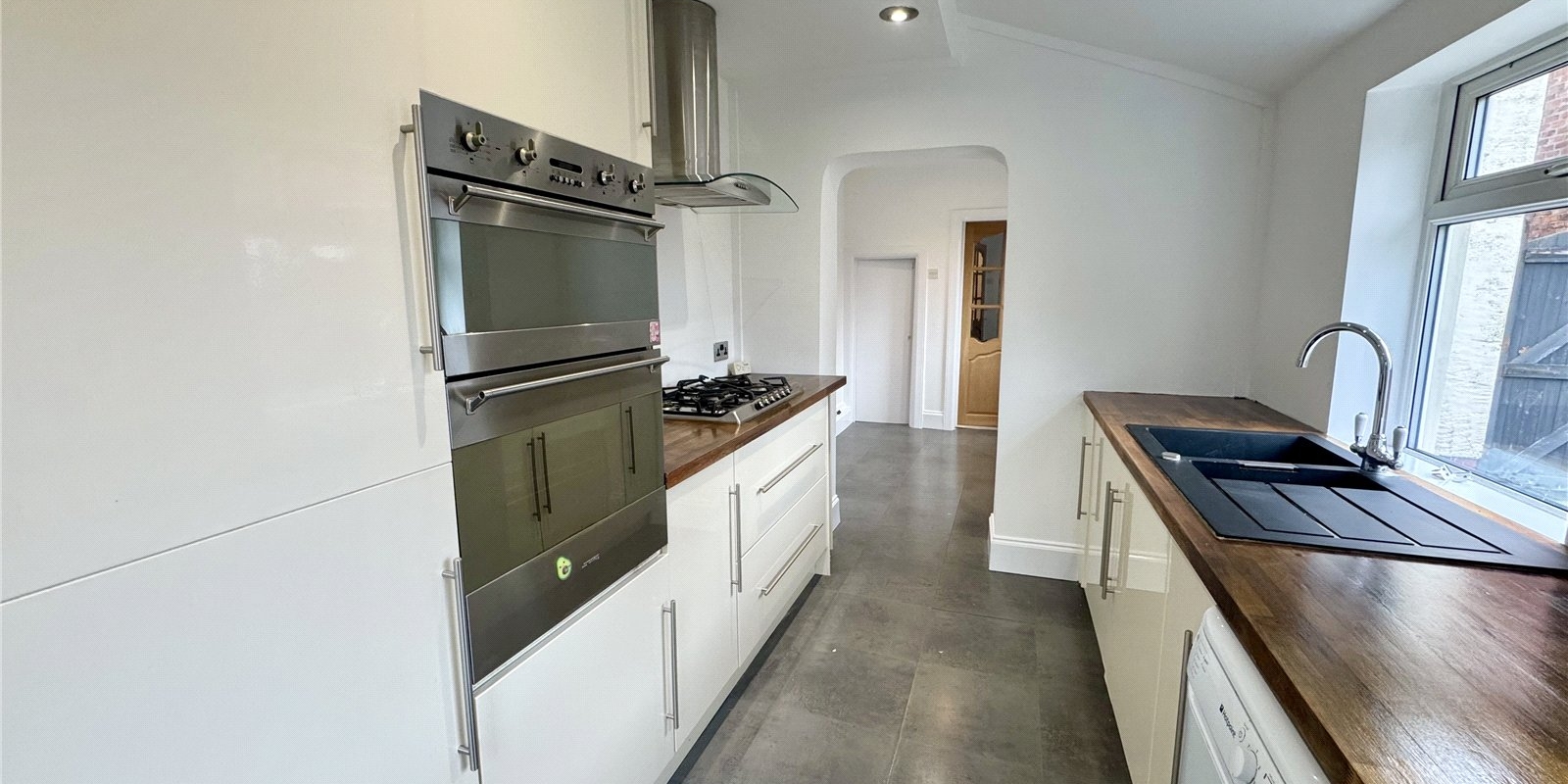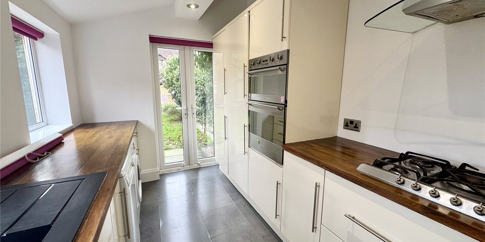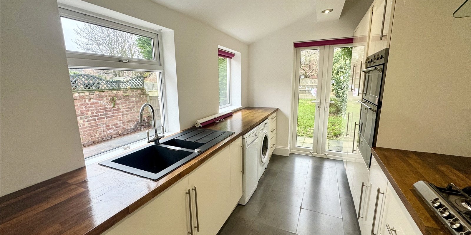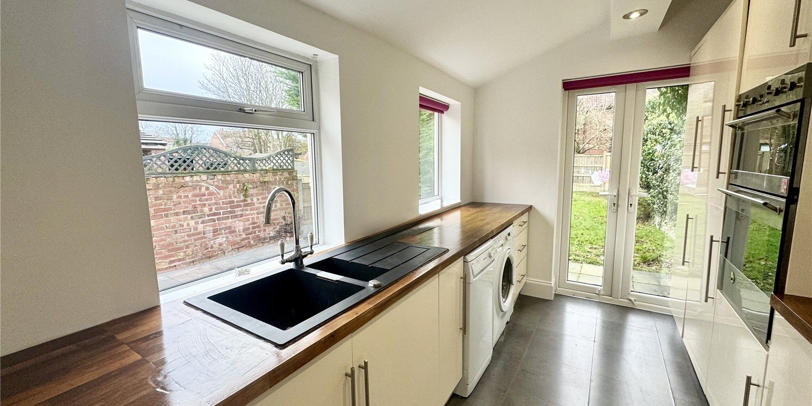 To the rear, the well-appointed kitchen provides ample space for a dining table, making it a practical and sociable hub of the home. The kitchen is fitted with integrated appliances and benefits from side access leading out to a patio area, while French doors open directly onto the garden, seamlessly blending indoor and outdoor living.