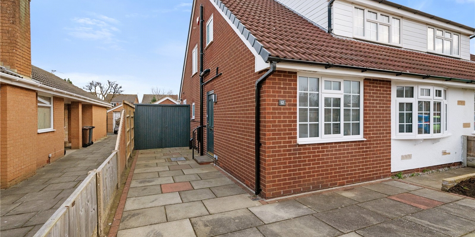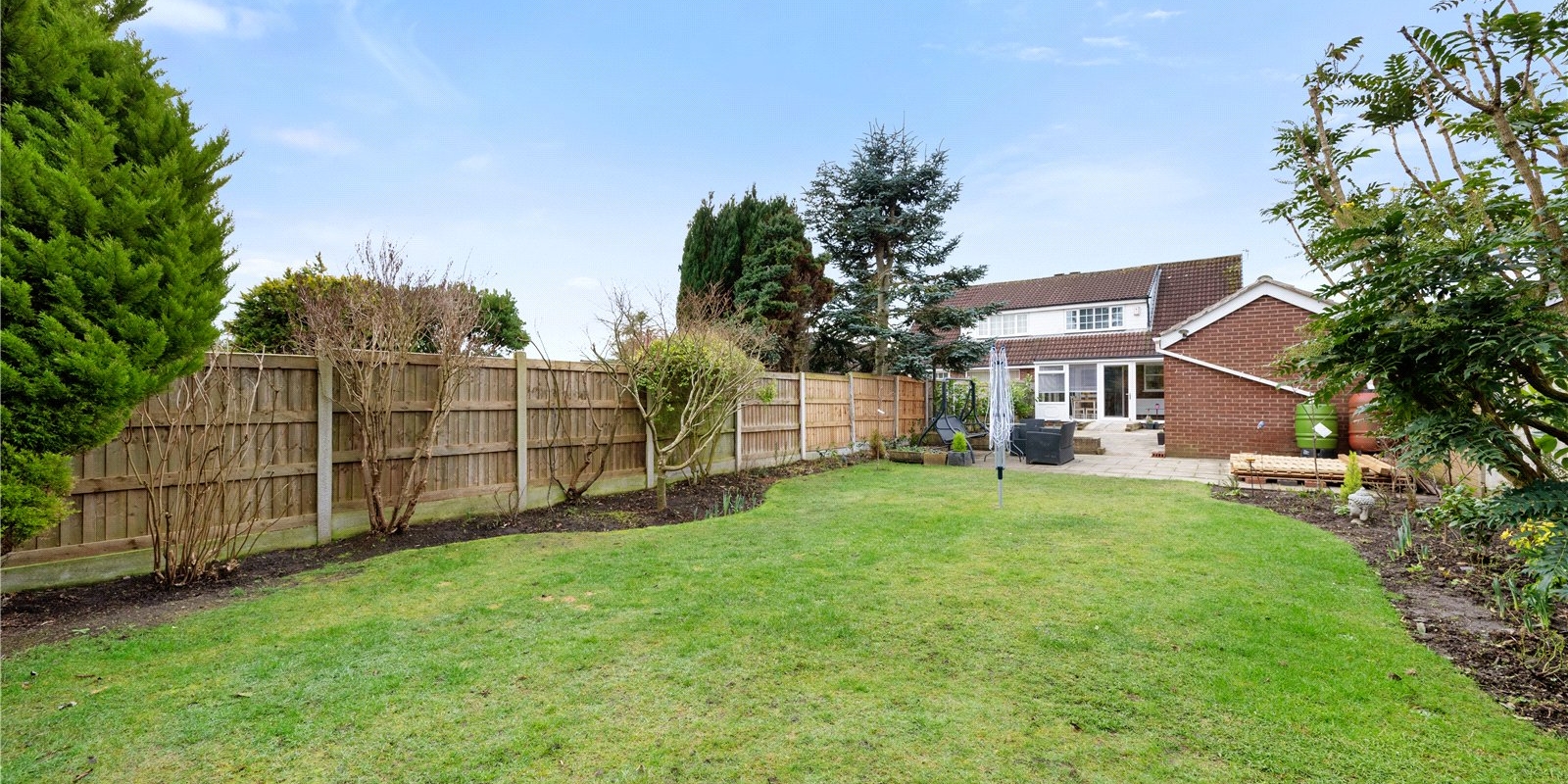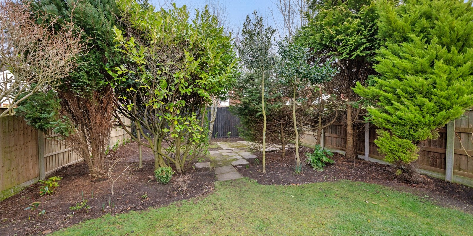 The home is set back from the road with a generous driveway, providing off-road parking for multiple vehicles. The neatly presented front garden is well-maintained, featuring an array of mature plants and shrubs that add color and vibrancy to the space. A well-maintained path leads to the front door, welcoming you into the property.