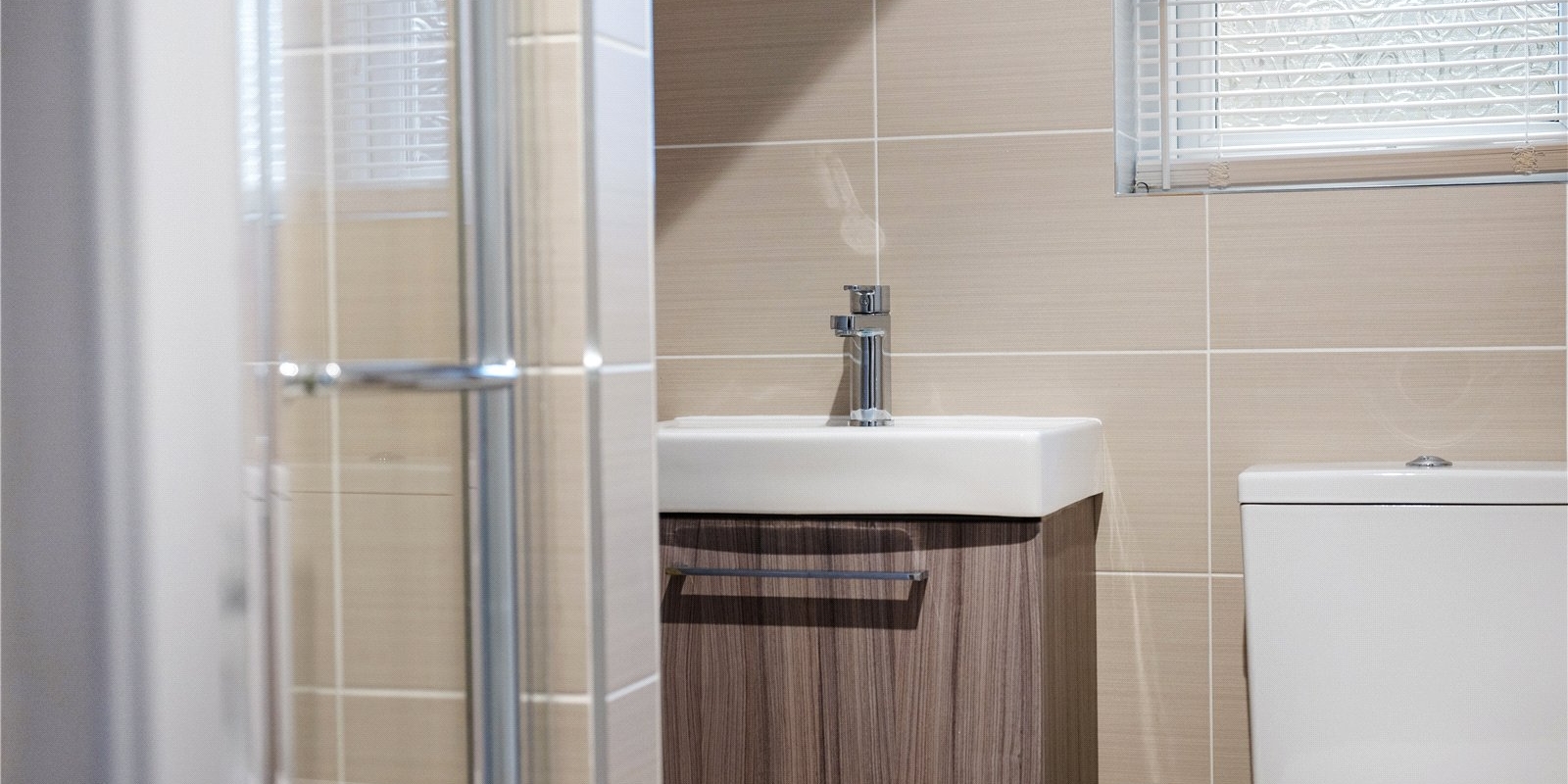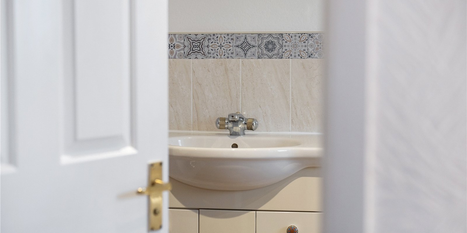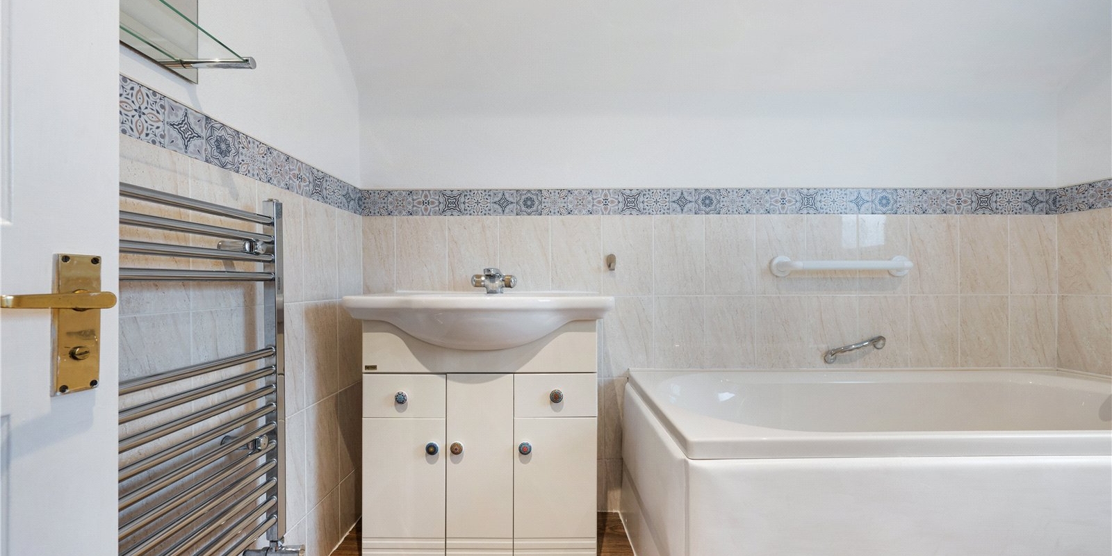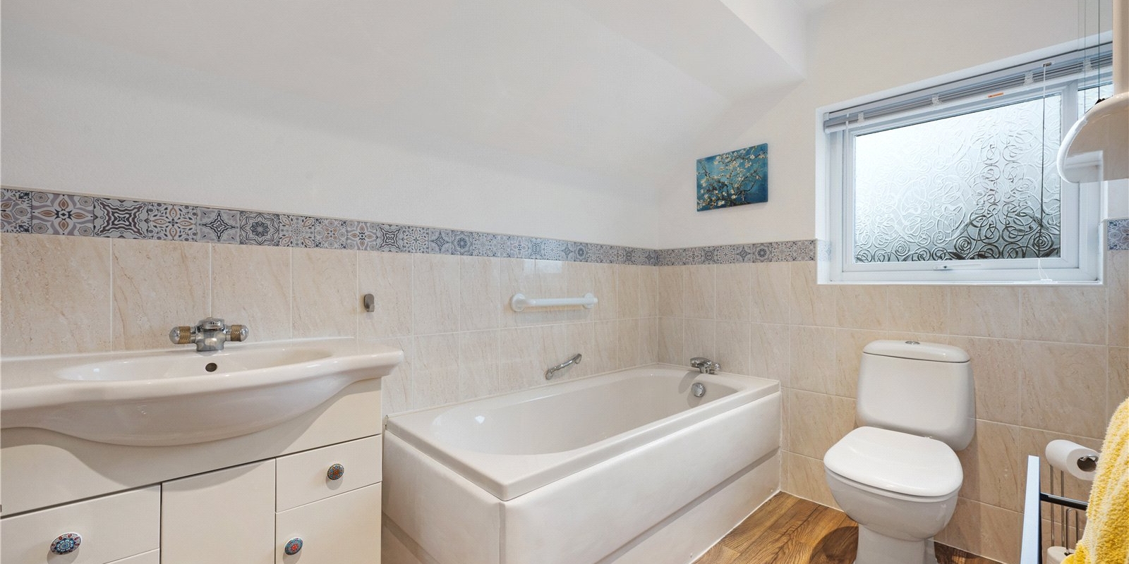 The family bathroom on the first floor is modern and functional, featuring neutral tiling and a three-piece suite, including a bathtub, WC, and washbasin. It is a comfortable space for family members to unwind.